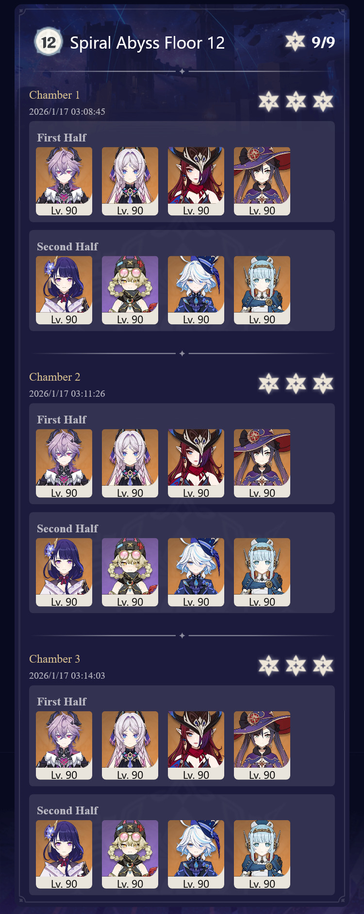 >Too shy to post or just wanted to make sure I get your clear?>Can't solve captcha to post?Send them to me privately here:https://form.jotform.com/253493679126468---------Luna IV 2026-01-16 Spiral Abyss StatisticsSample size: 187 (4/gig/, 8/gig/ and /gigvmg/)Finalized (2nd draft): 2026-01-20Character Usage (List view):https://files.catbox.moe/ydp0y0.pngOther Statistics: https://files.catbox.moe/p6z45h.png---------Congratulations to these anons for being:"4/gig/'s Top 10 SOVLFVL clears of Spiral Abyss 2026-01-16 Luna IV"#1. Clear #188 - >>554531354 - 951 points#2. Clear #171 - >>554256648 - 941 points#3. Clear #170 - >>554256603 - 939 points#4. Clear #31 - >>554034203 - 917 points#5. Clear #58 - >>554049071 - 916 points#6. Clear #80 - >>554067965 - 914 points#7. Clear #38 - >>554038504 - 908 points#8. Clear #118 - >>554095160 - 902 points#9. Clear #106 - >>554082418 - 897 points#10. Clear #71 - >>554059003 - 891 pointsLeaderboard: https://files.catbox.moe/5qrvtj.png(still running until 2026-02-16)---------How is the ranking tabulated?Every submissions get 1000 points as default grade,then the grade will be reduced based on voting data of this poll(Vote if you haven't/ Change your vote: https://strawpoll.com/B2ZB9wmqAgJ | Columbina & Zibai Options added)>Check if you can edit your votesSubmissions with similar grade will then be ranked by the order of submission time(earlier submission gets higher rank)---------I'm still collecting, anons until February 16th.Feel free to post your clear when you're done.