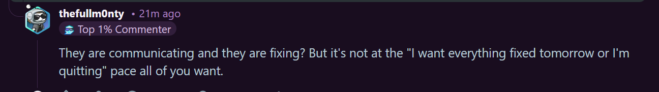 JuST GO in anD Fix EveRtHinG and maKe the GamE pErFeCt for MEEEEEEE rIGht NOOOOWWWWW!!!!!!The game is still pretty new. Look at No Mans Sky, the disaster it was and what it’s become. Nothing is perfect. Coding is hard. Let ‘em cook.