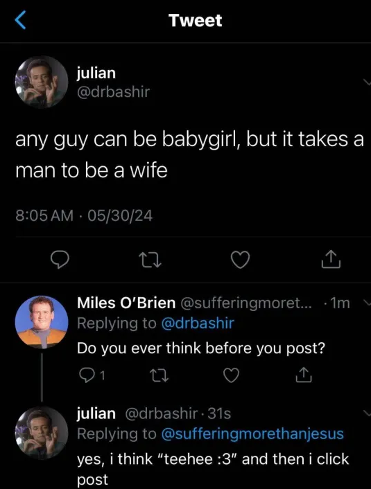 >>554547746>fujos also play male>yumes play femaleThere's simply no consensus and with voice AI getting better every year just forget trying to guess someone's gender