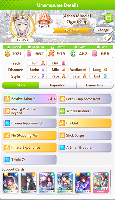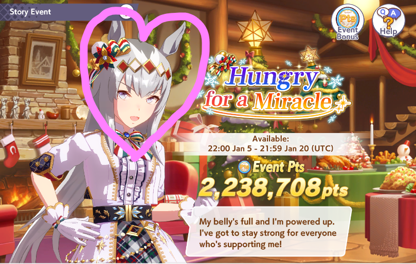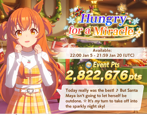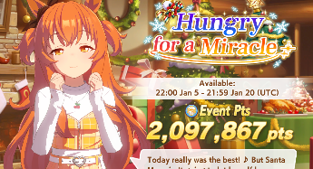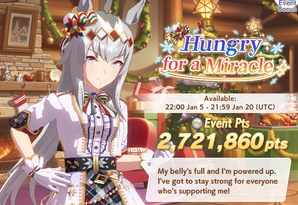 Previous: >>554532454>Global Game NewsLink your account to Cygames iDCurrent Scenario: Aoharu Hai aka "Unity Cup"Current Rate Up Trainee: Christmas Oguri Cap (3* alt), Christmas Biwa Hayahide (3* alt), Fine Motion (3*)Current Rate Up Support Cards: Narita Taishin (SSR), Mayano Top Gun (SSR), Manhattan Cafe (SSR), Inari One (SR)01/19 - Sagittarius Cup - Nakayama Turf 2500m01/22 - Tama 3*+Neicha SSR+Ogurin SSR - Legend Races01/27 - New Beginnings Part 101/29 - NY Opera & Haru 3*+Fuku SSR+Ayabe SSRMid February - Capricorn Cup - Chukyo Turf 1200mhttps://umamusume.com/news/100040/https://pages.snep.pw/uma/anni-skill-changes/>JP Game NewsCurrent Rate Up: Kiseki (3*), Support Card Select Pick UpNew Scenario "Yukoma Hot Spring" releasedTimeline: https://uma.moe/timelineCygames Webstore: https://webstore.cygames.com/en/umamusume_en/>Thread Clubshttps://rentry.co/umaglobalclublistYou must be E3 (20k points) to join a circle. Apply with /uma/ or /vg/ in your profile or post ID in the thread.>All Guides & Resourceshttps://rentry.org/uma26Game databasehttps://gametora.com/umamusume (Click the gear to switch between JP / global server info)A basic guide for newfagshttps://rentry.org/umaglobalFind networks if your region is blocked from the game or clienthttps://www.umavpn.top/93Seiyuu & Concertshttps://rentry.org/umstUma Texthttps://umareader.idsmile.xyz/
