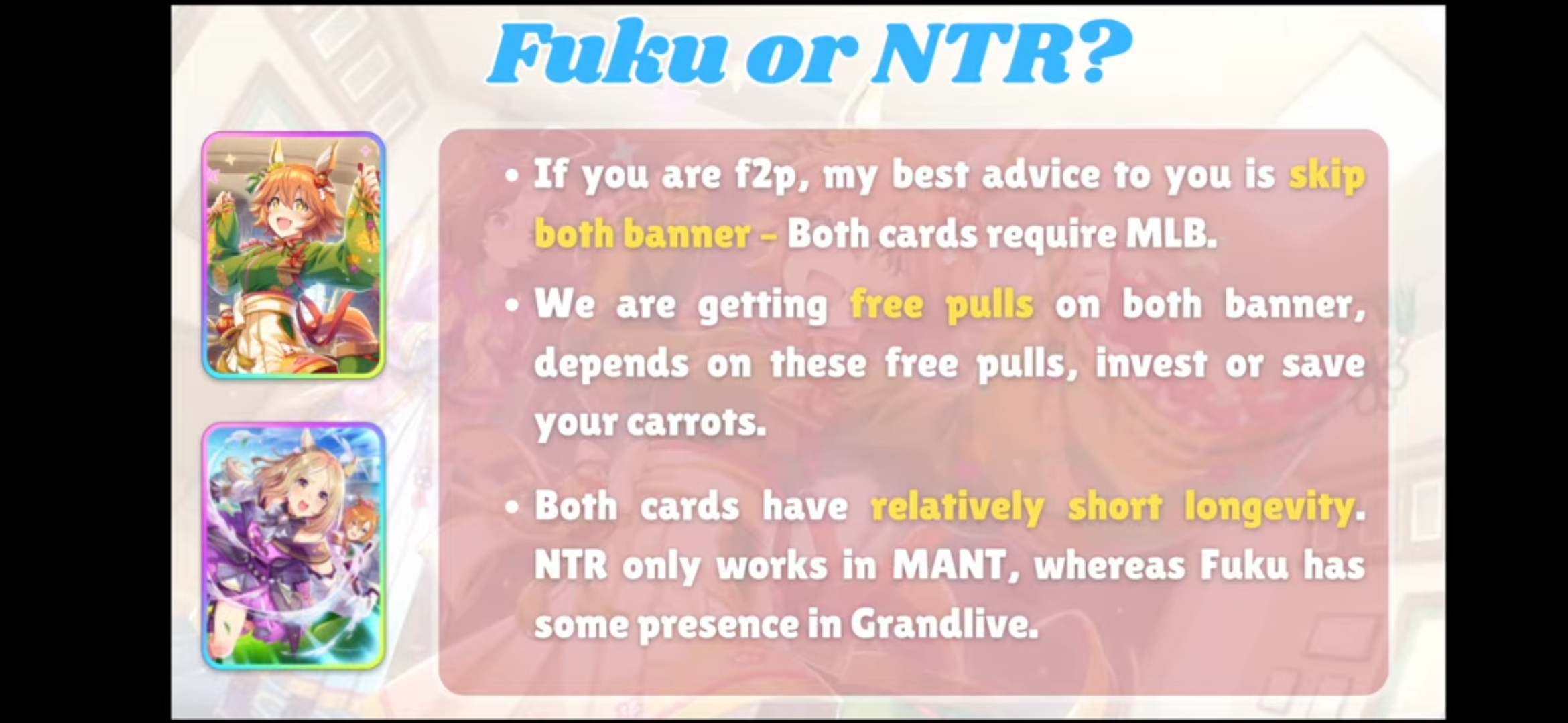 Is it worth building Sprint aces now or should I wait until Motherfuckerfukikitaru's Speed card releasesI've already gotten a 15.5k Oguri Cap built but for the others I might be better off waiting and going with Kitasan/Fuku/4 Wit cards