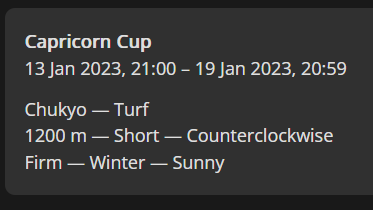 Previous: >>554532454>Global Game NewsLink your account to Cygames iDCurrent Scenario: Aoharu Hai aka "Unity Cup"Current Rate Up Trainee: Christmas Oguri Cap (3* alt), Christmas Biwa Hayahide (3* alt), Fine Motion (3*)Current Rate Up Support Cards: Narita Taishin (SSR), Mayano Top Gun (SSR), Manhattan Cafe (SSR), Inari One (SR)01/19 - Sagittarius Cup - Nakayama Turf 2500m01/22 - Tama 3*+Neicha SSR+Ogurin SSR - Legend Races01/27 - New Beginnings Part 101/29 - NY Opera & Haru 3*+Fuku SSR+Ayabe SSRMid February - Capricorn Cup - Chukyo Turf 1200mhttps://umamusume.com/news/100040/https://pages.snep.pw/uma/anni-skill-changes/>JP Game NewsCurrent Rate Up: Kiseki (3*), Support Card Select Pick UpNew Scenario "Yukoma Hot Spring" releasedTimeline: https://uma.moe/timelineCygames Webstore: https://webstore.cygames.com/en/umamusume_en/>Thread Clubshttps://rentry.co/umaglobalclublistYou must be E3 (20k points) to join a circle. Apply with /uma/ or /vg/ in your profile or post ID in the thread.>All Guides & Resourceshttps://rentry.org/uma26Game databasehttps://gametora.com/umamusume (Click the gear to switch between JP / global server info)A basic guide for newfagshttps://rentry.org/umaglobalFind networks if your region is blocked from the game or clienthttps://www.umavpn.top/93Seiyuu & Concertshttps://rentry.org/umstUma Texthttps://umareader.idsmile.xyz/