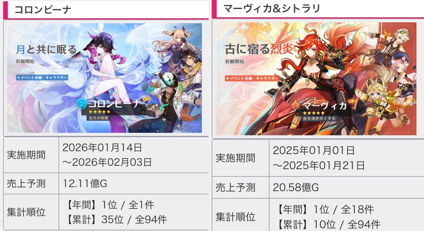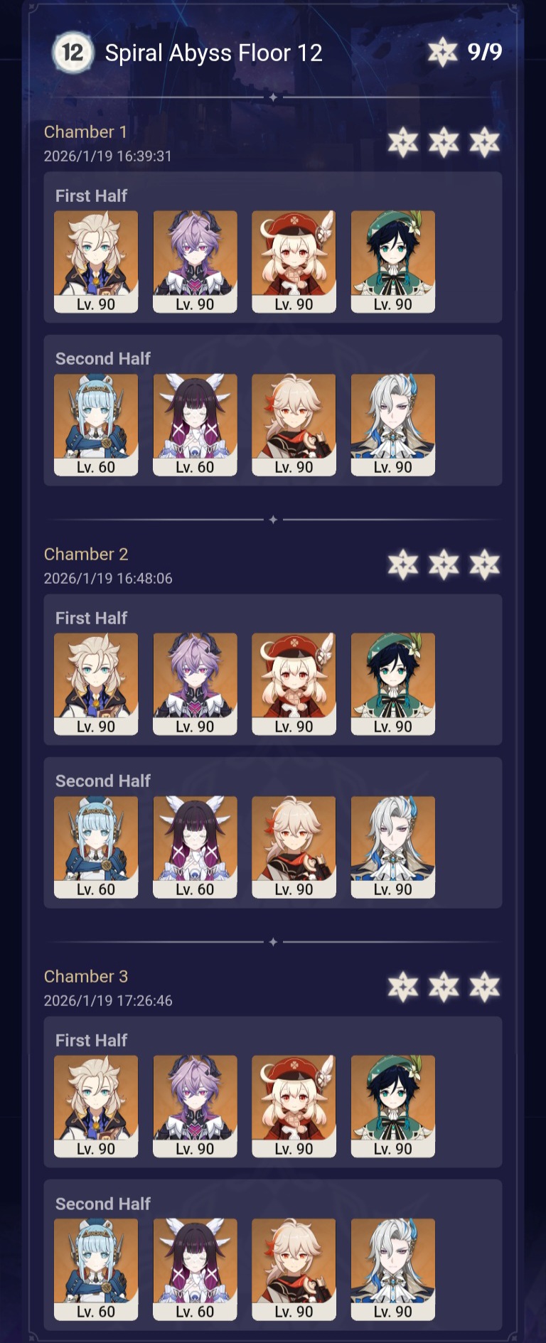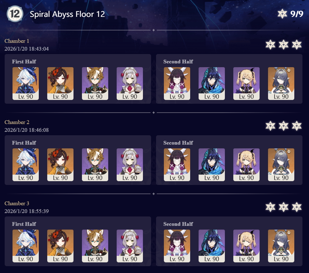 >Too shy to post or just wanted to make sure I get your clear?>Can't solve captcha to post?Send them to me privately here:https://form.jotform.com/253493679126468---------Luna IV 2026-01-16 Spiral Abyss StatisticsSample size: 188 (4/gig/, 8/gig/ and /gigvmg/)Finalized (2nd draft): 2026-01-20Character Usage (List view):https://files.catbox.moe/ydp0y0.pngOther Statistics: https://files.catbox.moe/p6z45h.png---------Congratulations to these anons for being:"4/gig/'s Top 10 SOVLFVL clears of Spiral Abyss 2026-01-16 Luna IV"#1. Clear #188 - >>554531354 - 951 points#2. Clear #171 - >>554256648 - 941 points#3. Clear #170 - >>554256603 - 939 points#4. Clear #31 - >>554034203 - 917 points#5. Clear #58 - >>554049071 - 916 points#6. Clear #80 - >>554067965 - 914 points#7. Clear #38 - >>554038504 - 908 points#8. Clear #118 - >>554095160 - 902 points#9. Clear #106 - >>554082418 - 897 points#10. Clear #71 - >>554059003 - 891 pointsLeaderboard: https://files.catbox.moe/5qrvtj.png(still running until 2026-02-16)---------How is the ranking tabulated?Every submissions get 1000 points as default grade,then the grade will be reduced based on voting data of this poll(Vote if you haven't/ Change your vote: https://strawpoll.com/B2ZB9wmqAgJ | Columbina & Zibai Options added)>Check if you can edit your votesSubmissions with similar grade will then be ranked by the order of submission time(earlier submission gets higher rank)---------I'm still collecting clears until February 16th.Feel free to post your clear when you're done.