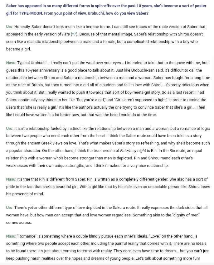 >>554588243Urobucher isn't wrong here. Saber and Shirou relationship in Fate route kinda feels kinda platonic and not passionate like between lovers.On this front the best mc x heroine relationship in TM is Shiki x Arc.