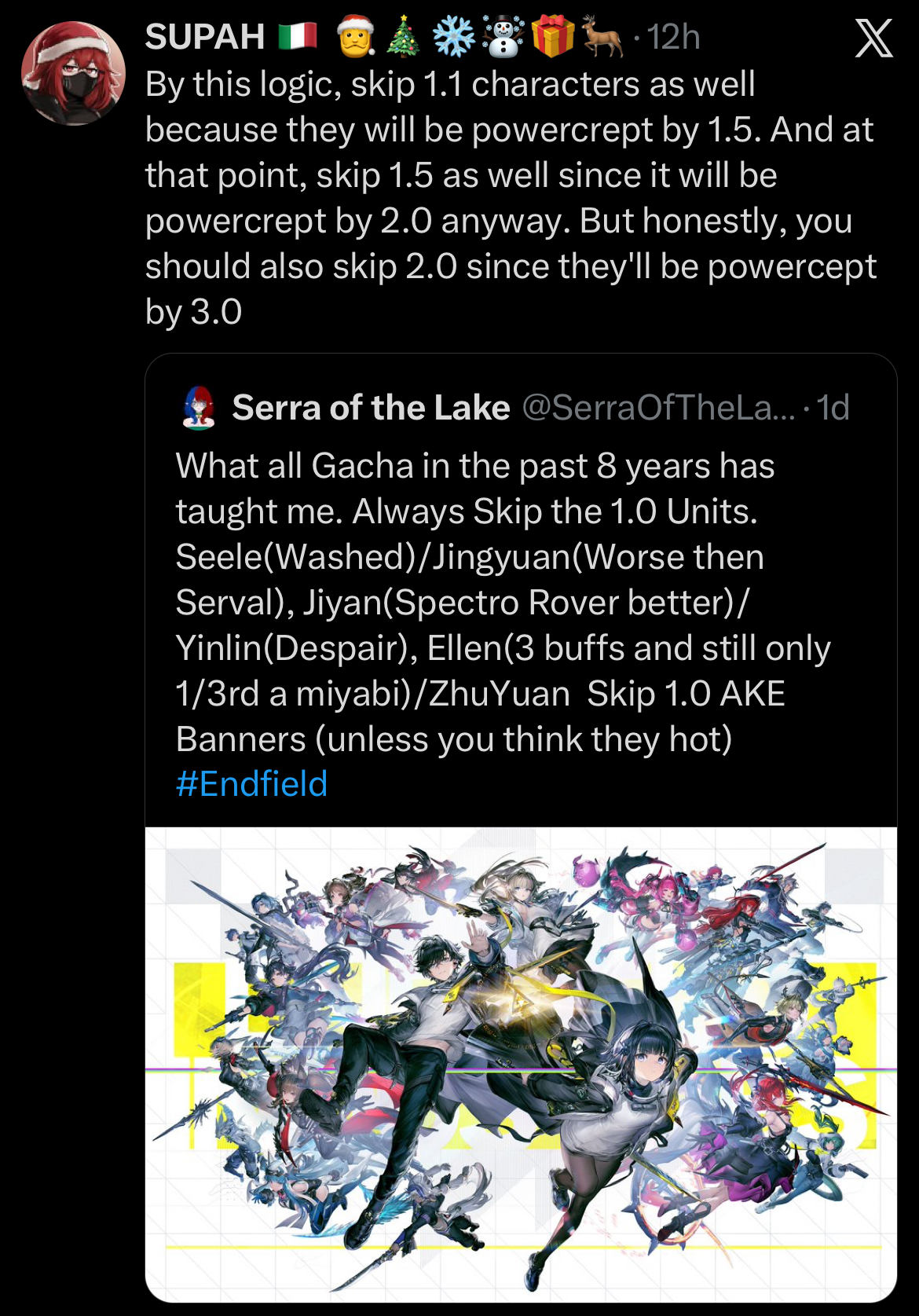 >>554605274Good. There's a reason they crossed over with Limbus. But their early writing was rough, and it seems that they're taking their sweet time setting up things in Endfield too. Whether Endfield eventually reaches the same level as the OG is an open question, especially given the difference in formats.