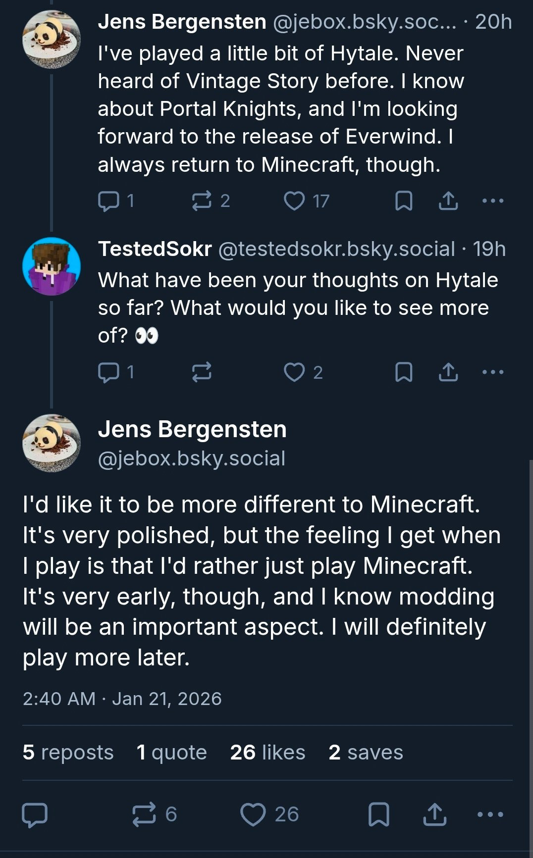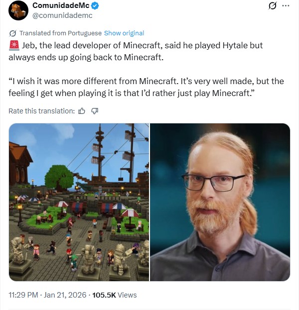 >>554781506>>554782075The problem is that minecraft is in such a backward state people want it to be more advanced and what do we get? Reskins of baby mobs for an update, there's so much minecraft needs to fix but they absolutely refuse to do anything other than cause more problems. I haven't touched hytale yet but so far from what I've seen they're already showing the potential to do what the players want, which hasn't been something minecraft took into consideration since notch still owned the gameHe can complain about it being too like minecraft but that's exactly why hytale started in the first place, it was created by modders of minecraft that created their own version within the game. Now they've made their own game that has no ties to minecraft, he wants it to be less like a clone because hytale will absolutely obliterate it in the future if they keep going in the direction they're headJeb is scared for minecrafts future and is pre-emptively claiming that hytale, a game made by minecraft modders who wanted minecraft but more, is too much like minecraft