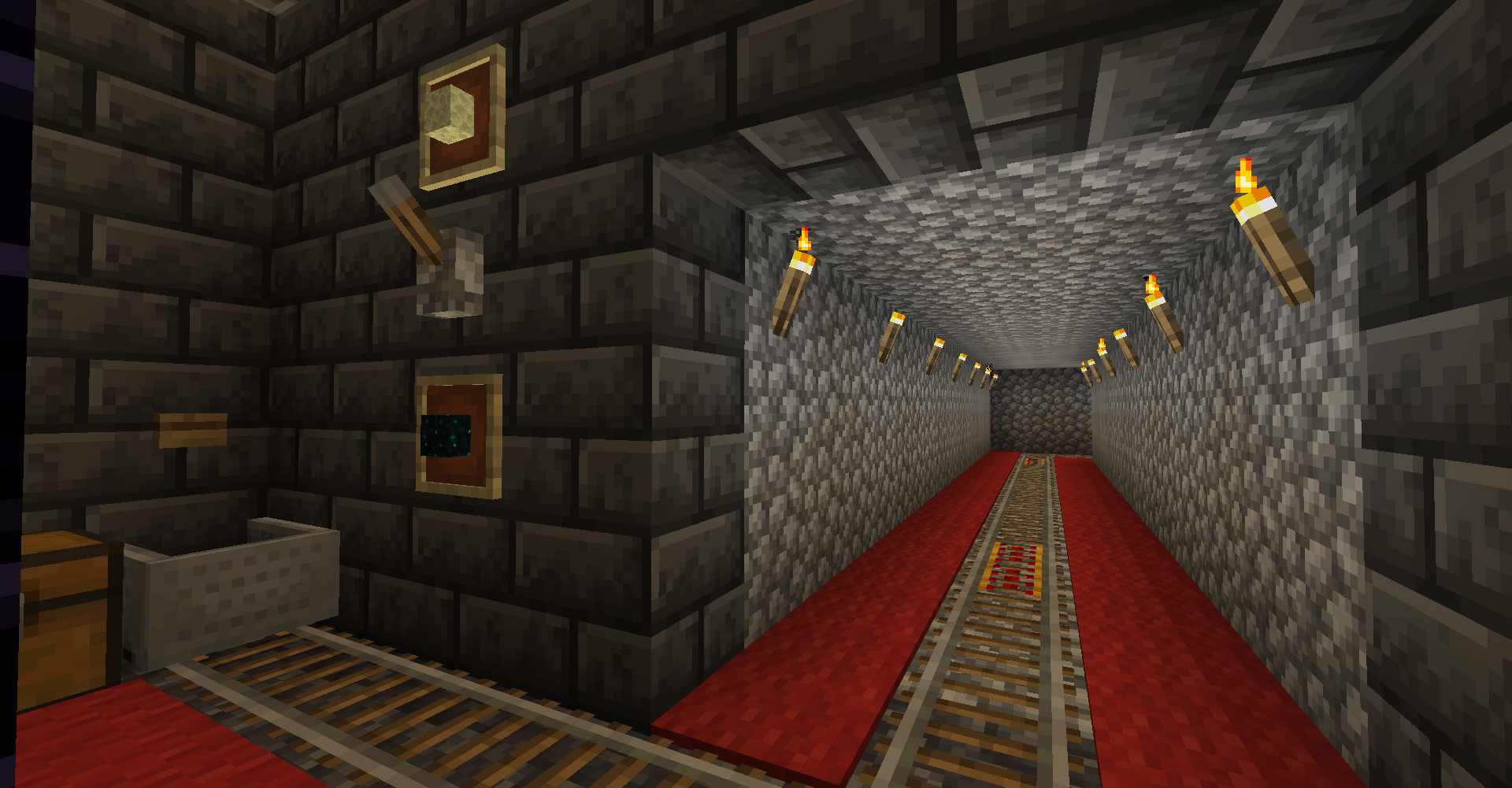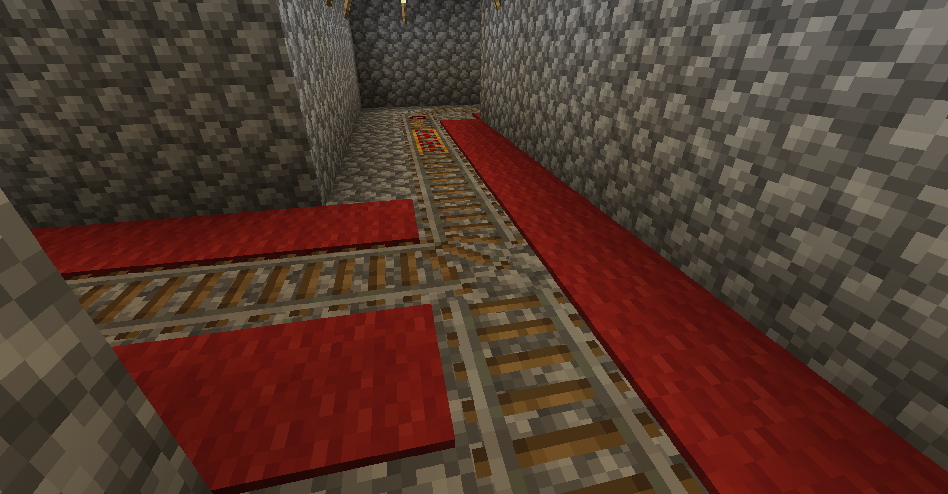 >>554886803Here's where the junction is, about 100 blocks away. The detector rail at the end is also able to switch the junction, so that when I come back from that direction (the stronghold), it will adjust the track so that I always end up going back to the nether hub (behind me), rather than to the ancient city. This was actually a major bit of redstoning, which uses an observer wall to send the signal straight down, and a t-flip-flop and redstone clock to keep the track open for long enough for the minecart to pass before switching back so that the lever at the hub is ultimately in control.Now I need to farm a shitton more red carpet, as I also widened the corridor so I don't have enough of them.