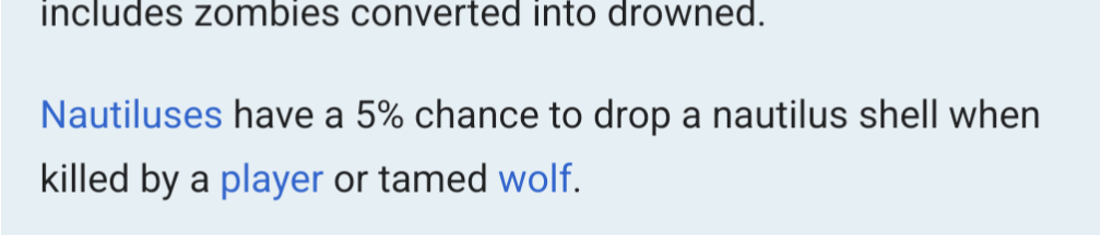 >>554970741Drowned only drop nautilus shells if the spawn holding one in their hand, so only natural drowned will have them. You can also kill nautiluses for them. They spawn about as often as squids.