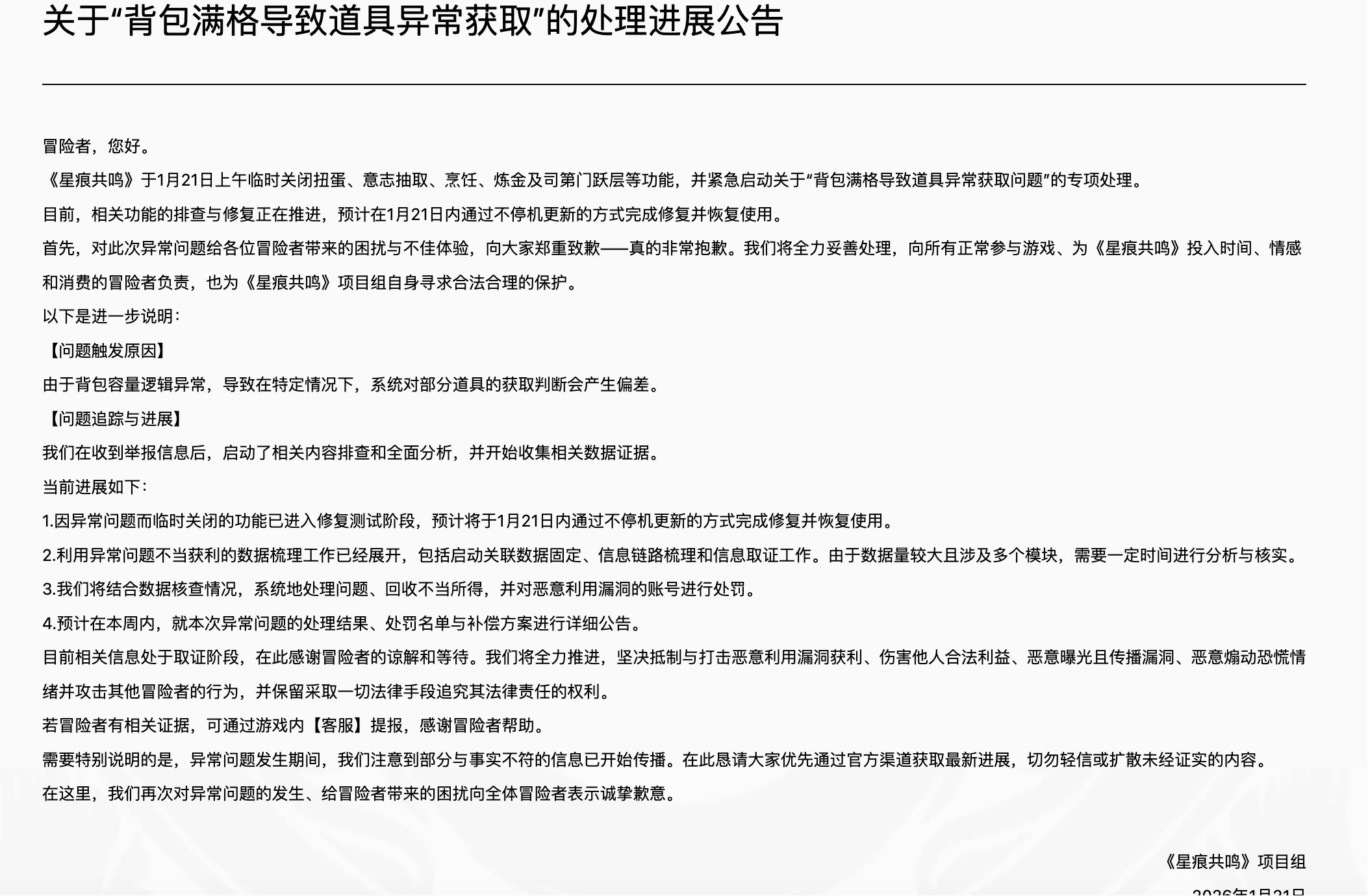 >>554618186I am a player of the game "Star Resonance," game ID: [8232], character name: Miaomiaomiao. To date, I have spent a total of 231,857 RMB on in-game purchases, aiming for a fair gaming experience and corresponding advantages. However, recently, a serious bug has appeared in the "Star Resonance" gameplay, allowing many players to exploit this loophole to obtain hundreds of thousands of gems, causing the game's economic system to collapse and the competitive balance to be completely disrupted—the value of the items I purchased has drastically decreased, rendering my purchases meaningless. According to Article 26 of the Consumer Rights Protection Law, the game operator's failure to guarantee service quality and timely fix of the bug constitutes a service defect; according to Article 53, I have the right to demand a full refund of my purchases. I am submitting proof of purchase (see attachment), screenshots related to the bug, and other evidence, and earnestly request a full refund within [7 working days]. Otherwise, I will further appeal to the 12315 platform and the cultural market supervision department.