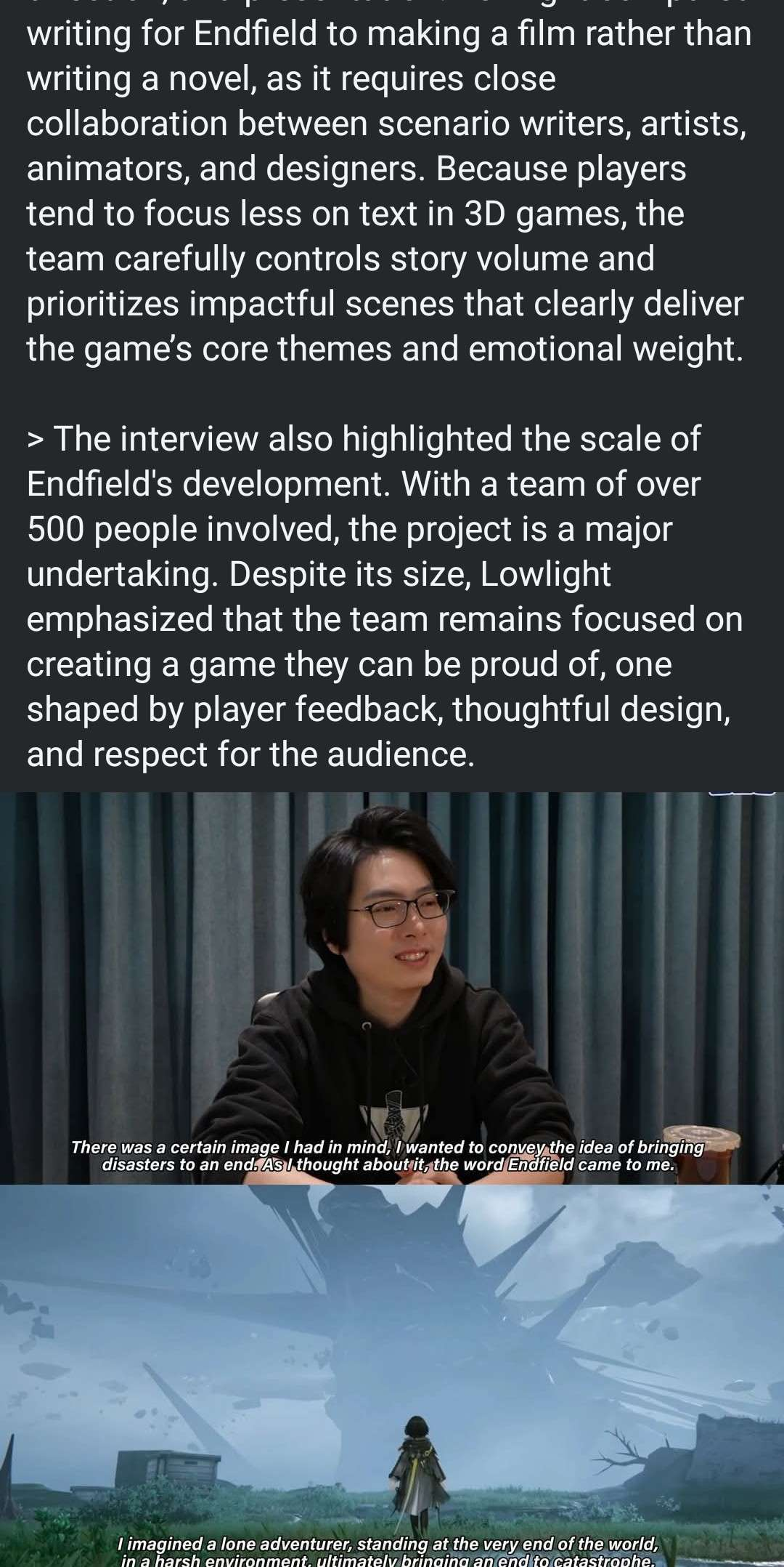 >The word evokes the image of standing at the edge of a devastated world, facing catastrophe directly and bringing it to an end.A lot of words to say nothing.Arknights on launch was exactly marketed like that and yet that promise was quickly forgotten.Endfield doesn't even evoke any image of devasation and "facing" anything.