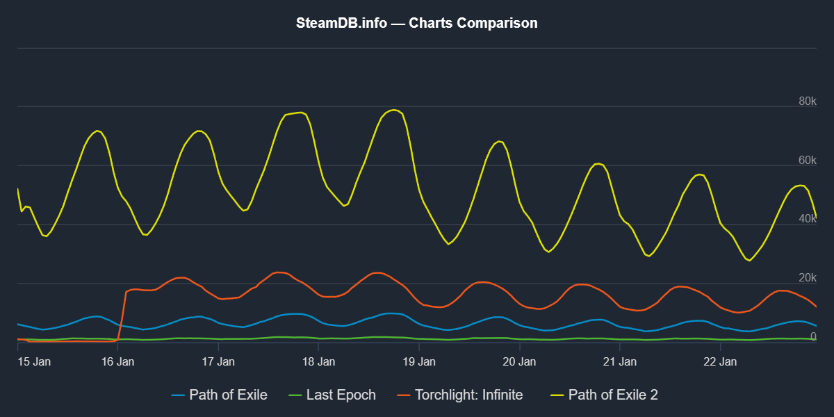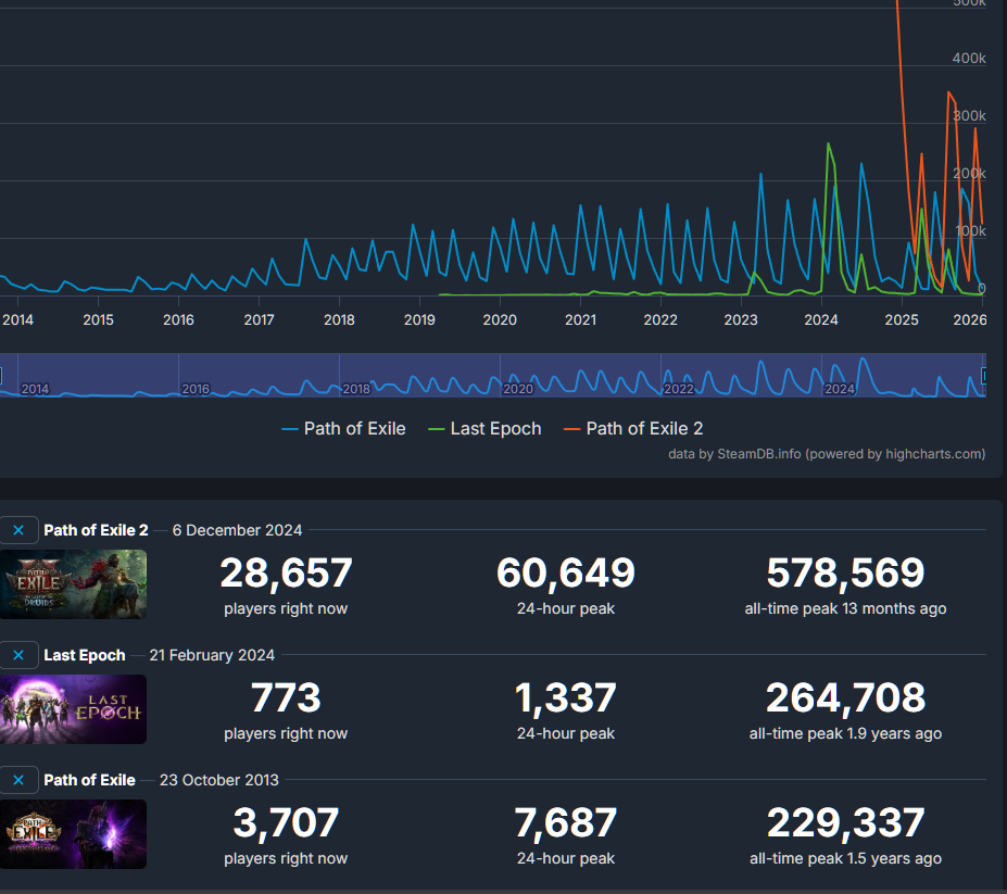 >>554628512>each leaguestart being considerably lower than the last0.1 - 580k0.2 - 246k0.3 - 350k0.4 - 290k>I am not looking at absolute numbersbecause the absolute numbers look great, you are looking at the 0.1 peak and then acting like that should be the baseline for every patch in the early access.
