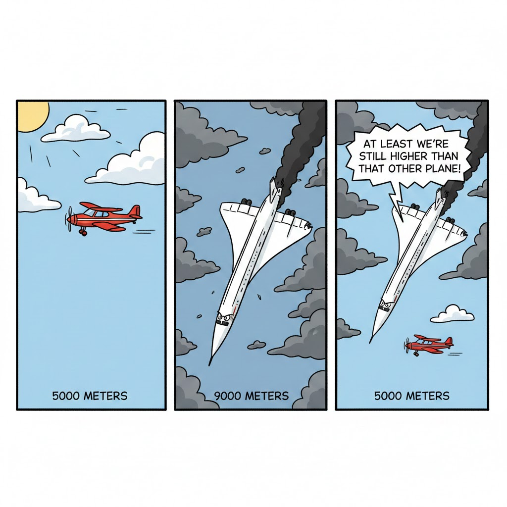 >plane A flies steadily at 5000 meters>plane B starts crashing to the ground at 8000 meters>plane B is now at 7000 meters>it's ok guys plane B might be crashing, but at least it's still higher than plane A so the crash isn't that badoh boy how do you even come up with this line of arguing?