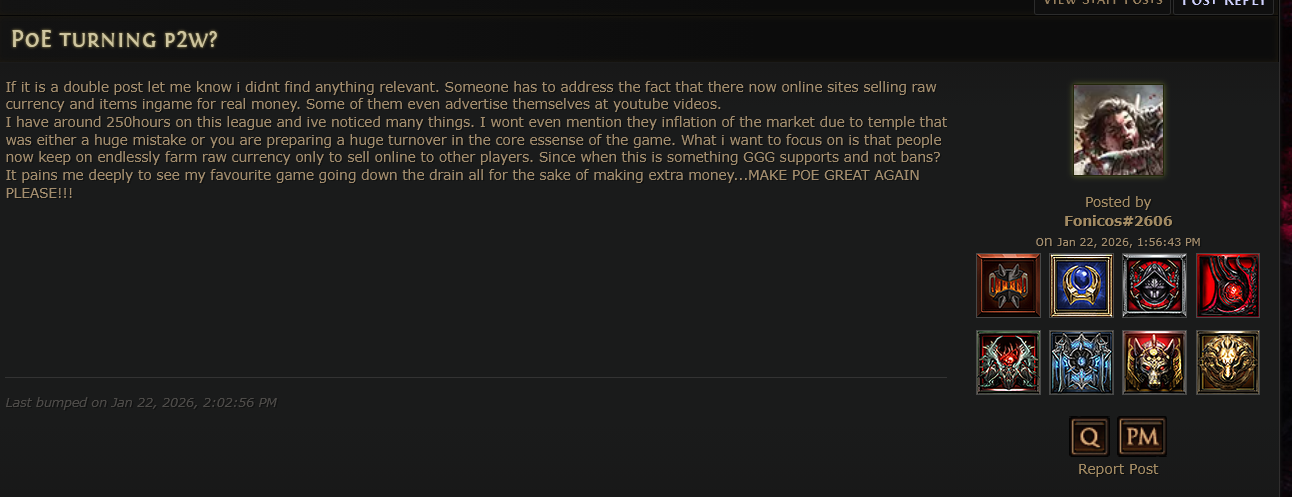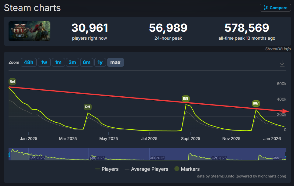 >>554629341We're not talking about poe1 right now, anon, we're talking about the very simple statement that is:>fewer players returning every league is not goodwe're not comparing apples to oranges, we're not trying to shill or compare to other games, we're not trying to deflect, we're simply trying to talk about how poo2 is hemorrhaging players rapidly league over league, and how that's not good.