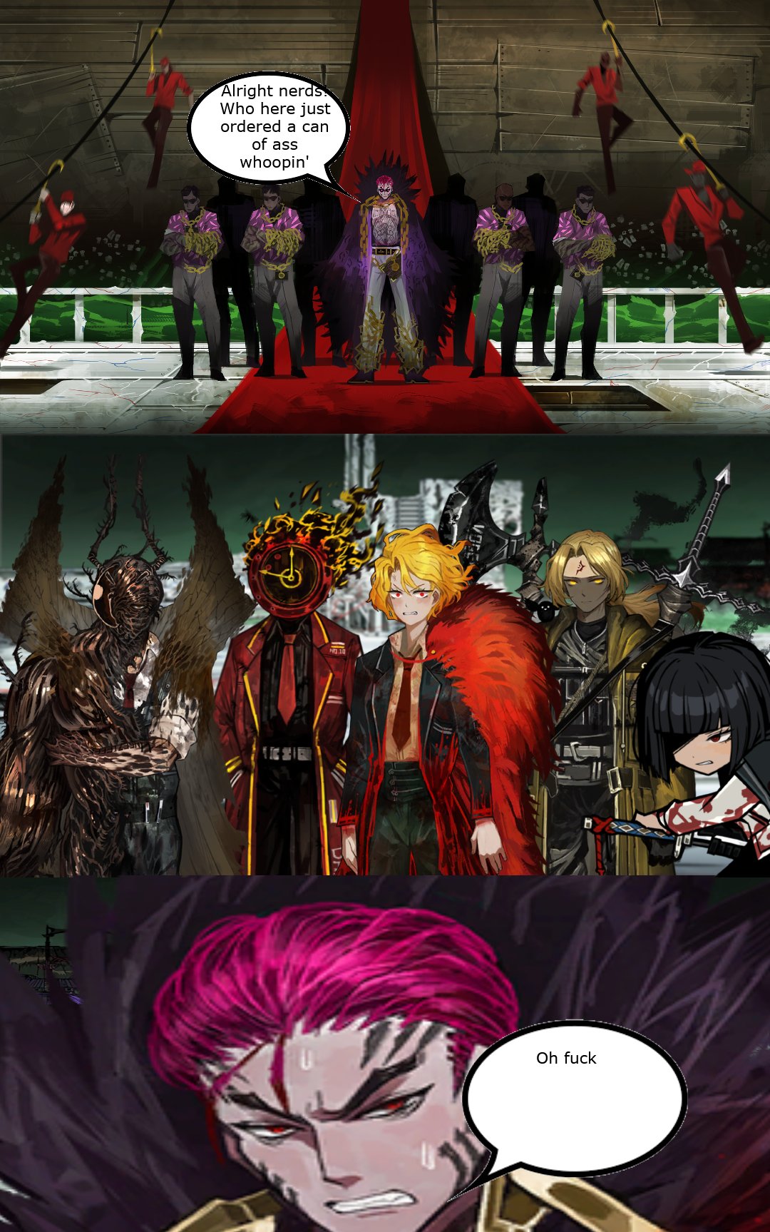 >>554627380Liu section 1 were fighting against the infinite Philip babies and suppressing him.Argalia shows up out of nowhere to 'pick him up'.Xiao and Argalia clash for a bit as Xiao questions what he's up to.Argalia babbles nonsense and has Oswald and Pluto steps in.Oswald summons a bunch of minions as Pluto teleports Oswald, Argalia, Philip and himself away as they're dealing with the Oswald minions.My personal impression is that while Argalia may be on the weaker end of Colors (given that Roland comments that his strength is more finding allies), in general all the 'top tiers' can at least hold their own against each other. I don't know whether Xiao or Argalia would come up the winner in a fresh 1v1, but the point is that neither of them would probably be able to win before interference sets in.Also Esther the Index proxy doesn't seem to fear Argalia either and seems willing to throw down with him if needed, although he's a member of the Index.>>554628068It was just Section 1.