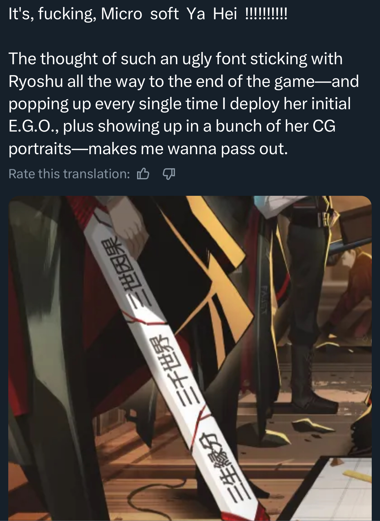 the asians are not happy with the apparently shit-tier font they used for the scabbard hieroglyphicslimbillion lunacy compensation pls