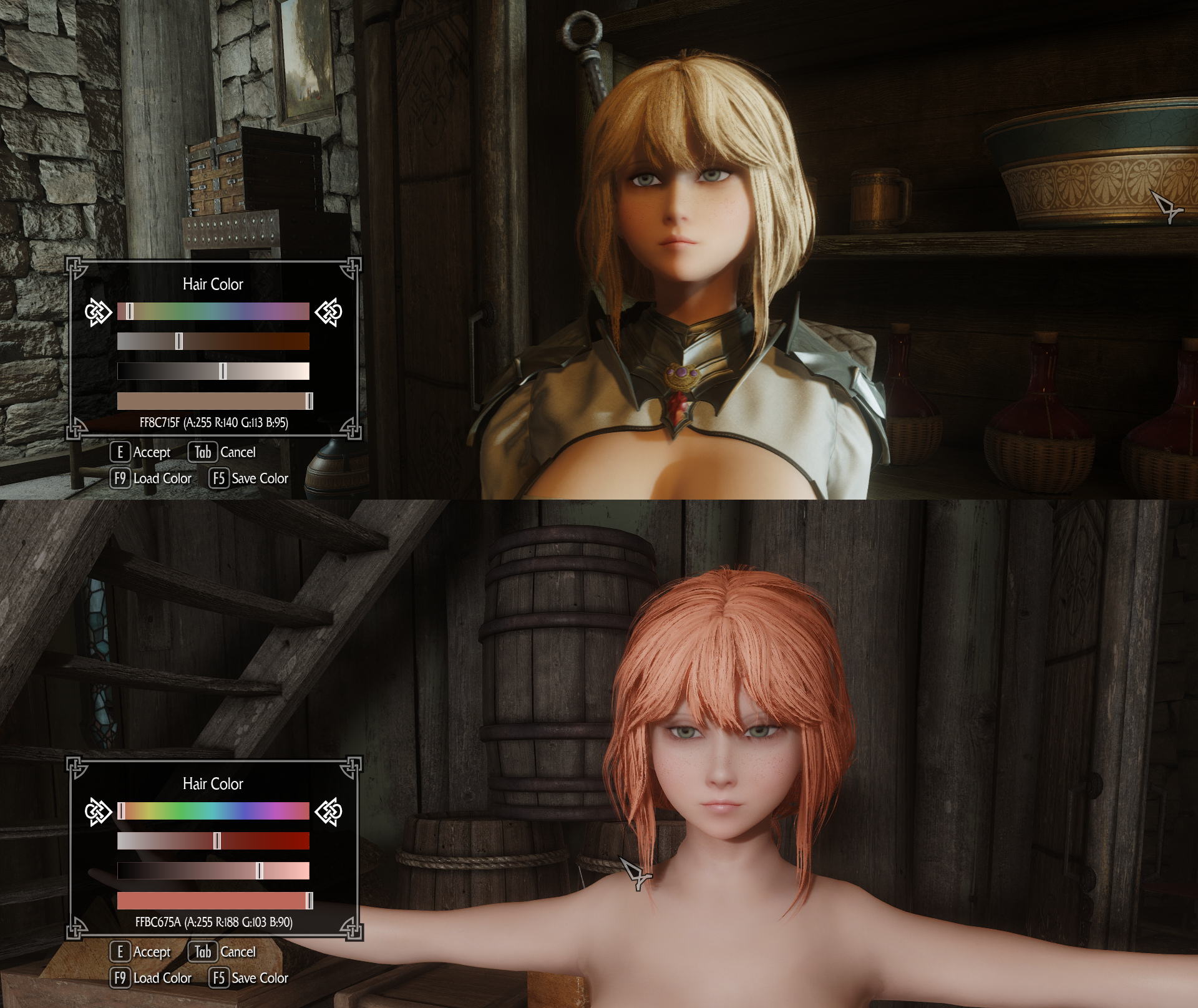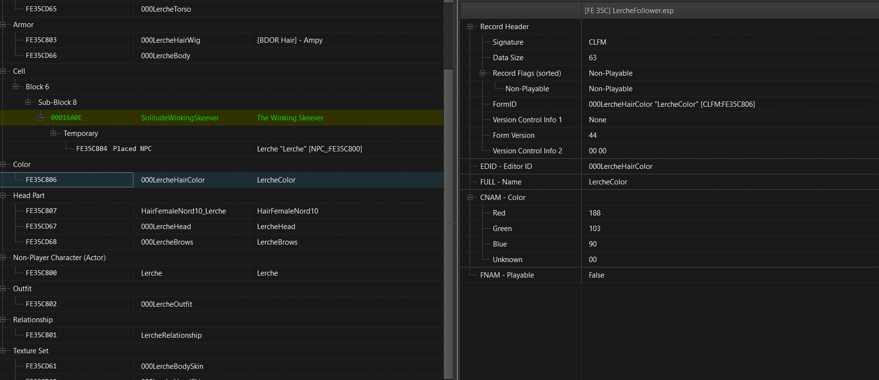 >>554638556Here are the values. Using a wig caused the color to be different (this happens on non-follower Lerche too) I made the follower use a hair color so that the wig would be almost the same. I wish I could help but I don't really understand the problem myself either, I just improvised.