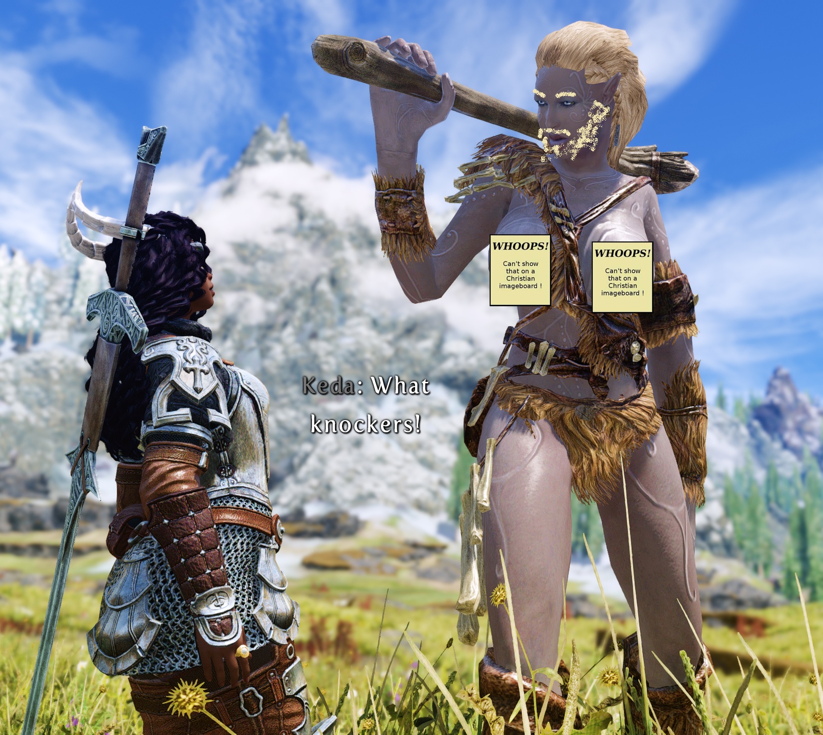 >>554708932I'm not German, but something like that.>>554707770Not sure what to say here though, it could be a skeleton issue. Maybe try deleting the skse folder in the mod (it includes the Mu Skeleton Editor) she won't be small anymore but it might make her usable at least.