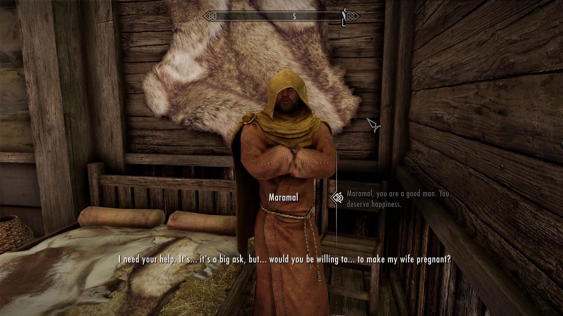 First Khajiit get shipped on a boat to Vvardenfell on a prison ship and has to walk on water to avoid fur getting wet, then when Khajiit gets to land a random Breton woman demands Khajiit pretend to be made-up fiance for woman's mother! She say she come in one day, but fishing village has no store! So Khajiit has to run to Bal Foyn just to buy expensive clothes, but only has enough gold for one glove. And now Khajiit is waiting for it to be tomorrow... This better be worth it for Khajiit.