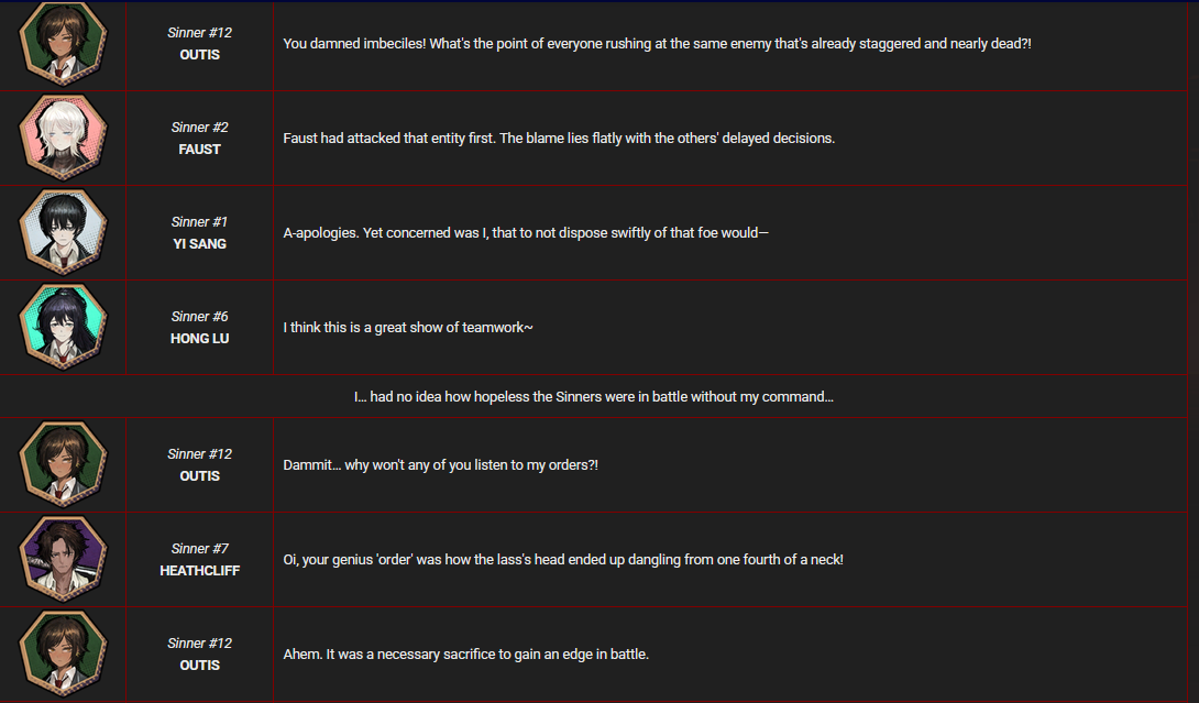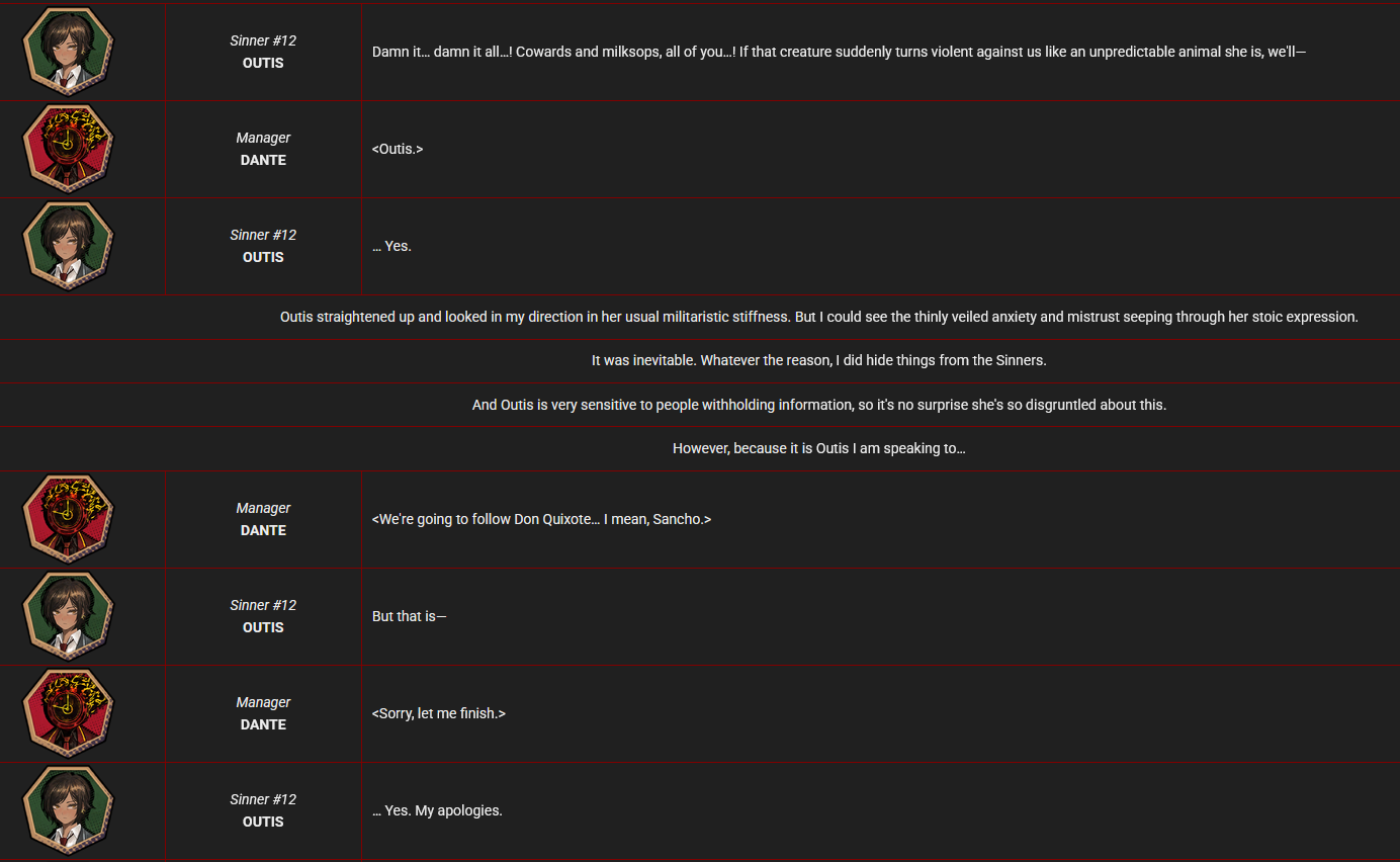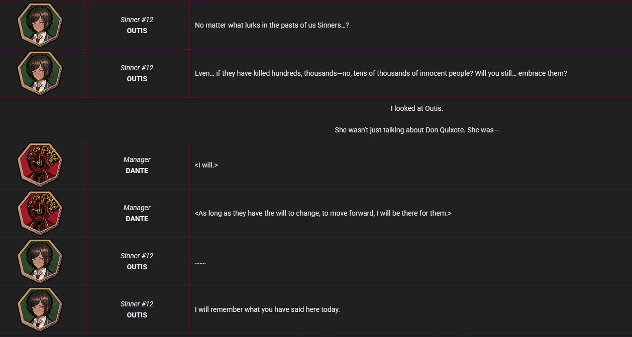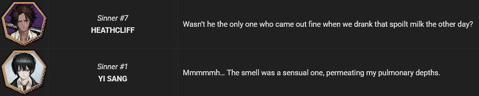 >>554654012Meursault's overt characterization starts early as the Hell's Chicken Intervallo in story. Rather than not feeling one way or another it's that he refuses to cast judgment on things. We can see from this very event that he is encouraged to share his thoughts and then he does so in a direct intense critical way. And very much has opinions. He will later go on to slowly be encouraged by Dante and crew to speak his mind more and talk about himself or his experiences (about childhood, Xmas Intervallo).He also has a tendency to mimic or tease by imitating other Sinners (Sinclair impression) or the quirks of how they speak(Yisang, HC Intervallo). Through his IDs and uptie stories you can see more of how he processes and thinks of things (NCorp ID) etc. He also provides some "advice" to Sinclair about repeated exposure to the things that scare him are stress him so that he can become dulled to them and not as reactive/frozen or overwhelmed when they happen. He's also had multiple quirks referenced from his source, staring contests, newsprint, people watching / observation. He makes an effort to comfort Heathcliff when he picks up on Catherine's passing and suggests that they prioritize Heathcliff's safety rather than the acquisition of the Golden Boughs. There are lots of other things stated to be fact about his character but they're more in the realm of his acute observation skills etc.Meursault's character is one that is subtle, and sometimes not. But all the little tidbits and nods here and there leading up to us seeing his inner world and that critic we met briefly during the HC event are there for people who are interested.>Suddenly, Meursault let out a cry as he clutched his chest, then fell to the floor.