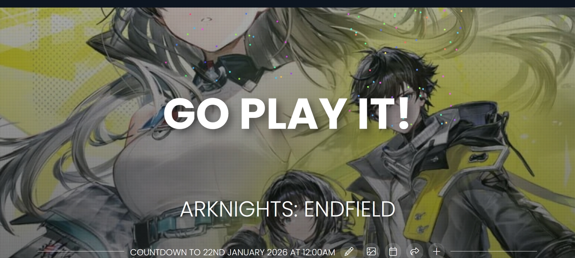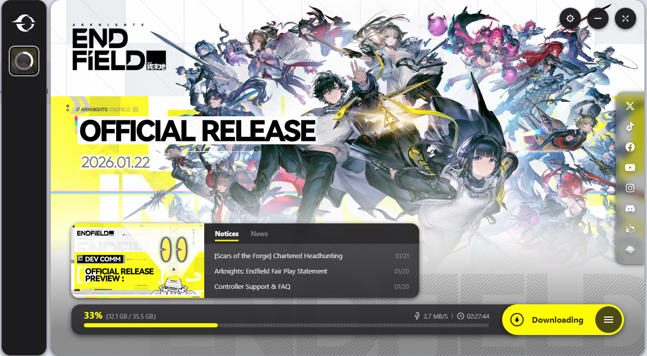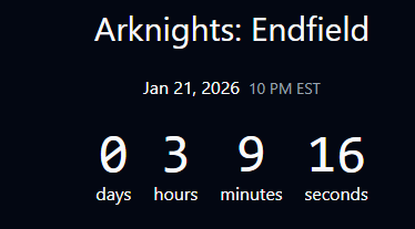 Previous thread: >>5546977573 HOURS UNTIL LAUNCH!>Official Website (PRE-REGISTER and PRE-DOWNLOAD HERE)https://endfield.gryphline.com/en-us>Official EN X (NEWS HERE)https://x.com/AKEndfield>LAUNCH DATE AND TIMES:January 21st07:00 PM (Los Angeles, PST)09:00 PM (Chicago, CST)10:00 PM (New York, EST)January 22nd00:00 AM (Argentina, UTC-03)03:00 AM (London, GMT)04:00 AM (Berlin, CET)06:00 AM (Riyadh, UTC +3)11:00 AM (Beijing, GMT +8)12:00 PM (Tokyo, UTC +9)02:00 PM (Sydney, AEDT)>Platforms/Where to DownloadWindows/PC - Epic Games Store and standalone launcher (Downloadable on the official website)Android - Google Play StoreiOS - App StorePlayStation 5 - PlayStation Store>Launch Reward CodesValid from Release to January 29th, 11:59 PM (UTC +8) (Redeem in-game)RETURNOFALLALLFIELDENDFIELDGIFTENDFIELD4PC>Voyage to the Stars (Special event to launch your name into space)January 16th, 09:00 PM (UTC +8), to March 4th, 11:59 PM (UTC +8)https://endfield.gryphline.com/activity/voyage-to-the-stars/en-us/>Special Launch Streamhttps://www.youtube.com/watch?v=dz2g_D52NR0>Official Release Trailerhttps://www.youtube.com/watch?v=oJ00ggFb8A0>Official Release PV'shttps://www.youtube.com/watch?v=5Xm45NwWOlohttps://www.youtube.com/watch?v=UPpeeft1-8ohttps://www.youtube.com/watch?v=tN80M6IEMo0>f2p?Yes, on all platforms, but you can buy an optional launch bundle on the PS5 for $9.99.>Wikishttps://wiki.skport.com/endfield (Official)https://perlica.moehttps://warfarin.wiki/enhttps://endfield.wiki.gg/>System Requirementshttps://perlica.moe/system-requirements>Operators (Playable characters)https://warfarin.wiki/en/operators>Stickershttps://drive.google.com/drive/folders/13KH3L6QPIKkVH7pBddv4uxwmwJsnOtklhttps://drive.google.com/drive/folders/1OuVtjv1k-9c3M6n7d4PX3CGG5bkwH04ahttps://drive.google.com/drive/folders/1AStB8bzFk3lSwMwczWPkFYCBrZe0vHOghttps://drive.google.com/drive/folders/1yS0lqUhxf8tBRtpDFfCU1y16IS2sSeF7