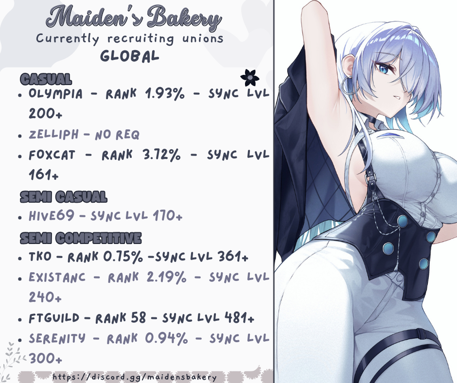Global Union PANTSUUU has spots available and we are looking for new members to fill. Be part of the best /nikg/ superunion today!PANTSUUU - need one sweaty player for the next union raid. At least sync 541+PANTSUU2 - need one new player at least syc301+PANTSUU3 - need one new member, any level.Make sure you add nikg in your profile so we know you're from here.AEON, UNNIE and strong members of Prefect, join us so we can beat these discord-based outsiders back to the outer rim.