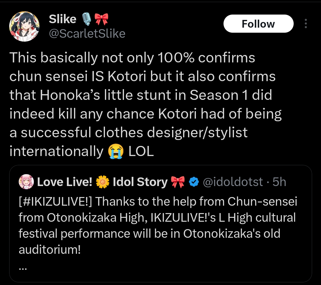 >writing tweetsBetter than doing absolutely nothing from Nijigasaki to Liella. I think she did the Niji manga that came with beach towels or something like that. She also wrote Polka's first song. https://www.youtube.com/watch?v=04t_L8Okvbg