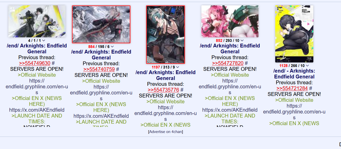 Previous thread: >>554749630SERVERS ARE OPEN!>Official Websitehttps://endfield.gryphline.com/en-us>Official EN X (NEWS HERE)https://x.com/AKEndfield>LAUNCH DATE AND TIMES:NOWFIELD>Platforms/Where to DownloadWindows/PC - Epic Games Store and standalone launcher (Downloadable on the official website)Android - Google Play StoreiOS - App StorePlayStation 5 - PlayStation Store>Launch Reward CodesValid from Release to January 29th, 11:59 PM (UTC +8) (Redeem in-game)RETURNOFALLALLFIELDENDFIELDGIFTENDFIELD4PC>Voyage to the Stars (Special event to launch your name into space)January 16th, 09:00 PM (UTC +8), to March 4th, 11:59 PM (UTC +8)https://endfield.gryphline.com/activity/voyage-to-the-stars/en-us/>Special Launch Streamhttps://www.youtube.com/watch?v=dz2g_D52NR0>Official Release Trailerhttps://www.youtube.com/watch?v=oJ00ggFb8A0>Official Release PV'shttps://www.youtube.com/watch?v=5Xm45NwWOlohttps://www.youtube.com/watch?v=UPpeeft1-8ohttps://www.youtube.com/watch?v=tN80M6IEMo0>f2p?Yes, on all platforms, but you can buy an optional launch bundle on the PS5 for $9.99.>Wikishttps://wiki.skport.com/endfield (Official)https://perlica.moehttps://warfarin.wiki/enhttps://endfield.wiki.gg/>System Requirementshttps://perlica.moe/system-requirements>Operators (Playable characters)https://warfarin.wiki/en/operators>Stickershttps://drive.google.com/drive/folders/13KH3L6QPIKkVH7pBddv4uxwmwJsnOtklhttps://drive.google.com/drive/folders/1OuVtjv1k-9c3M6n7d4PX3CGG5bkwH04ahttps://drive.google.com/drive/folders/1AStB8bzFk3lSwMwczWPkFYCBrZe0vHOghttps://drive.google.com/drive/folders/1yS0lqUhxf8tBRtpDFfCU1y16IS2sSeF7