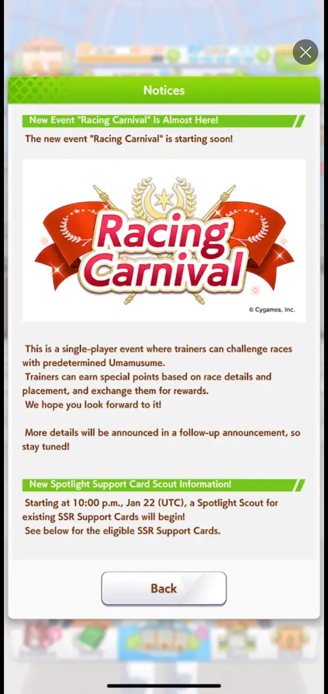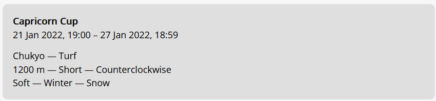 Previous: >>554724480>Global Game NewsLink your account to Cygames iDCurrent Scenario: Aoharu Hai aka "Unity Cup"Current Rate Up Trainee: Christmas Oguri Cap (3* alt), Christmas Biwa Hayahide (3* alt), Fine Motion (3*)Current Rate Up Support Cards: Narita Taishin (SSR), Mayano Top Gun (SSR), Manhattan Cafe (SSR), Inari One (SR)01/19 - Sagittarius Cup - Nakayama Turf 2500m01/22 - Tama 3*+Neicha SSR+Ogurin SSR - Legend Races (free 50 pulls)01/27 - New Beginnings Part 101/29 - NY Opera & Haru 3*+Fuku SSR+Ayabe SSRMid February - Capricorn Cup - Chukyo Turf 1200mhttps://umamusume.com/news/100040/https://pages.snep.pw/uma/anni-skill-changes/>JP Game NewsCurrent Rate Up: Kiseki (3*), Support Card Select Pick UpNew Scenario "Yukoma Hot Spring" releasedTimeline: https://uma.moe/timelineCygames Webstore: https://webstore.cygames.com/en/umamusume_en/>Thread Clubshttps://rentry.co/umaglobalclublistYou must be E3 (20k points) to join a circle. Apply with /uma/ or /vg/ in your profile or post ID in the thread.>All Guides & Resourceshttps://rentry.org/uma26Game databasehttps://gametora.com/umamusume (Click the gear to switch between JP / global server info)A basic guide for newfagshttps://rentry.org/umaglobalFind networks if your region is blocked from the game or clienthttps://www.umavpn.top/93Seiyuu & Concertshttps://rentry.org/umstUma Texthttps://umareader.idsmile.xyz/