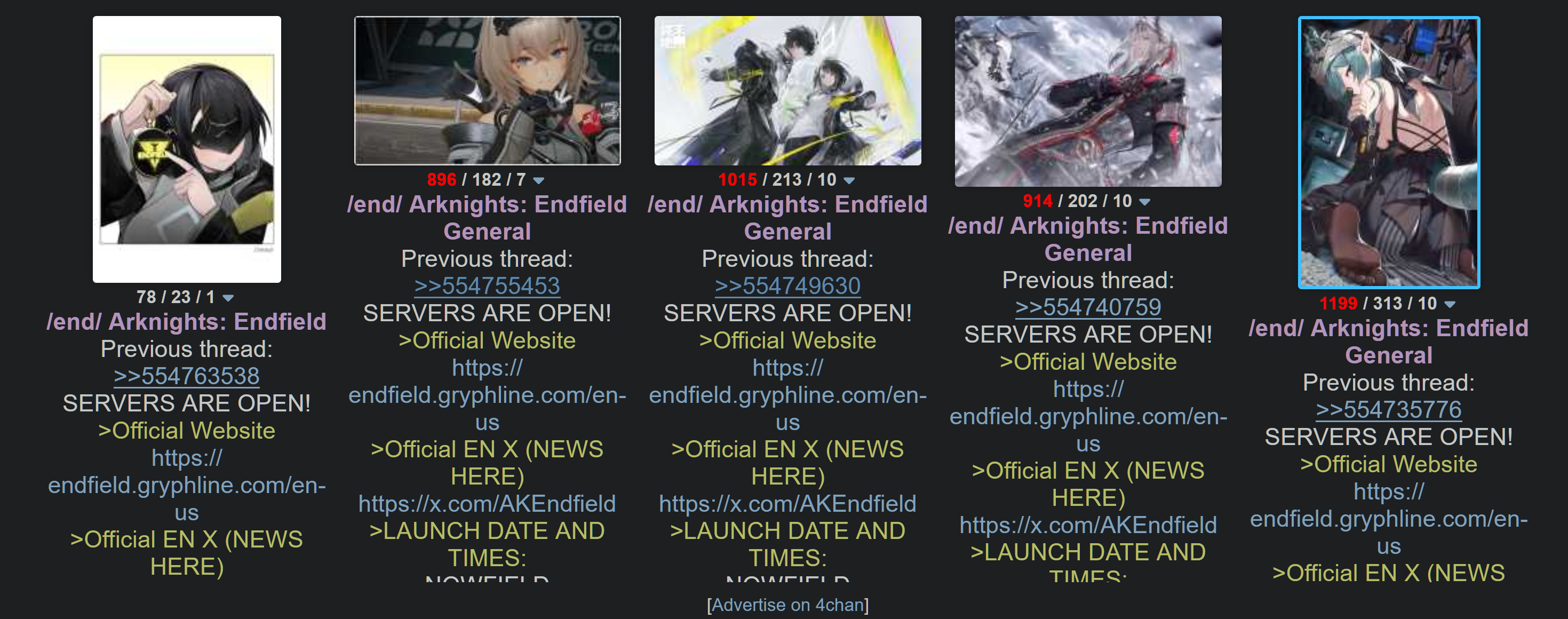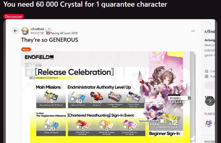 Previous thread: >>554763538SERVERS ARE OPEN!>Official Websitehttps://endfield.gryphline.com/en-us>Official EN X (NEWS HERE)https://x.com/AKEndfield>LAUNCH DATE AND TIMES:NOWFIELD>Platforms/Where to DownloadWindows/PC - Epic Games Store and standalone launcher (Downloadable on the official website)Android - Google Play StoreiOS - App StorePlayStation 5 - PlayStation Store>Launch Reward CodesValid from Release to January 29th, 11:59 PM (UTC +8) (Redeem in-game)RETURNOFALLALLFIELDENDFIELDGIFTENDFIELD4PC>Voyage to the Stars (Special event to launch your name into space)January 16th, 09:00 PM (UTC +8), to March 4th, 11:59 PM (UTC +8)https://endfield.gryphline.com/activity/voyage-to-the-stars/en-us/>Special Launch Streamhttps://www.youtube.com/watch?v=dz2g_D52NR0 [Open]>Official Release Trailerhttps://www.youtube.com/watch?v=oJ00ggFb8A0 [Open]>Official Release PV'shttps://www.youtube.com/watch?v=5Xm45NwWOlo [Open]https://www.youtube.com/watch?v=UPpeeft1-8o [Open]https://www.youtube.com/watch?v=tN80M6IEMo0 [Open]>f2p?Yes, on all platforms, but you can buy an optional launch bundle on the PS5 for $9.99.>Wikishttps://wiki.skport.com/endfield (Official)https://perlica.moehttps://warfarin.wiki/enhttps://endfield.wiki.gg/>System Requirementshttps://perlica.moe/system-requirements>Operators (Playable characters)https://warfarin.wiki/en/operators>Stickershttps://drive.google.com/drive/folders/13KH3L6QPIKkVH7pBddv4uxwmwJsnOtklhttps://drive.google.com/drive/folders/1OuVtjv1k-9c3M6n7d4PX3CGG5bkwH04ahttps://drive.google.com/drive/folders/1AStB8bzFk3lSwMwczWPkFYCBrZe0vHOghttps://drive.google.com/drive/folders/1yS0lqUhxf8tBRtpDFfCU1y16IS2sSeF7