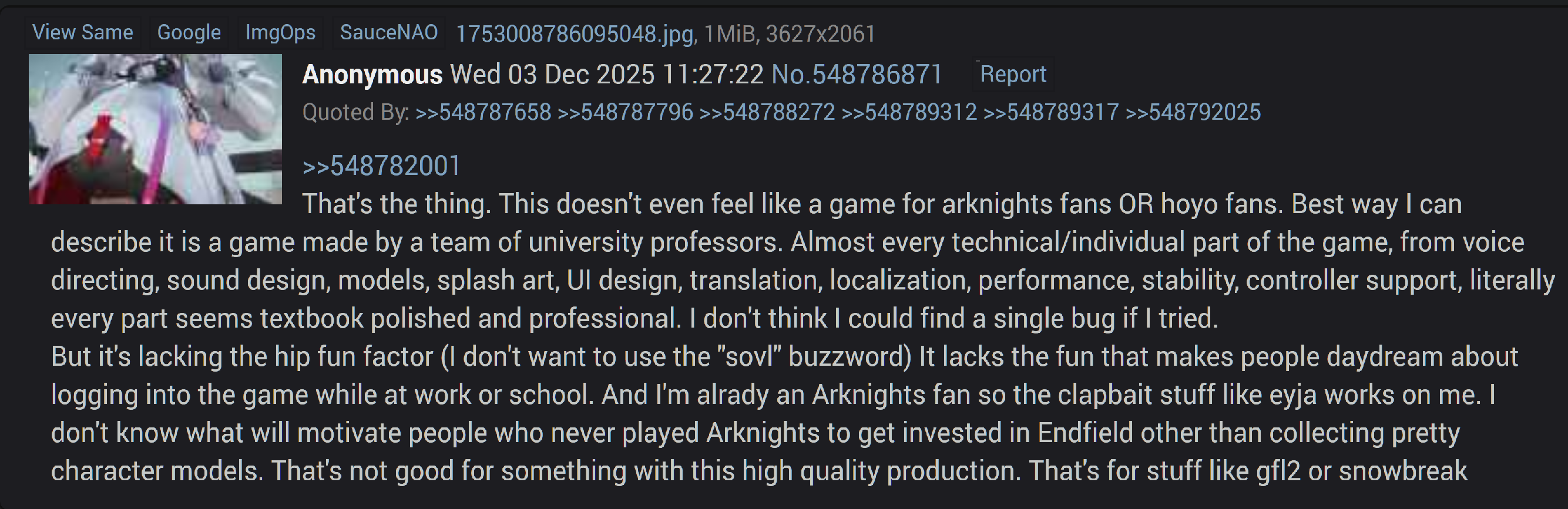 >>554778747Nyo, people also play mihomo games. Endfield will do just fine, carried by retards.