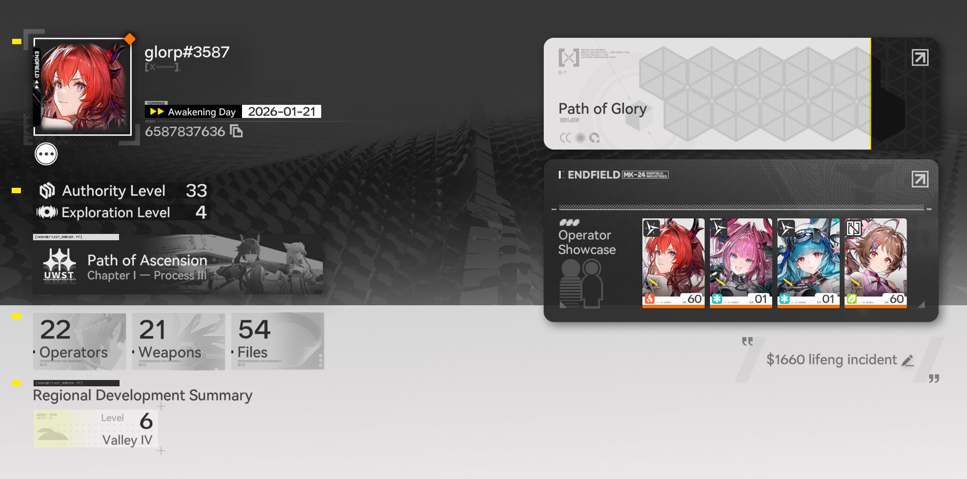 Just finished 24 hour session in Arknights Endfieldended at lv33, max refreshed day 1 and beginning of day 2overall thoughts- optimization is INSANELY good; the only game i've been able to dual-stream twitch/yt + play at 120 fps,0 frame drops the entire session, many chatters also reported very good performance on mid-low end devices / mobile- the paypal incident i'm aware of, my spending were purely through card so i didn't experience it myself- $1660 p5 lifeng incident- combat gets better and better to more you familiarize yourself with it- factory building / overworld traversal / map linking is a pretty core part of the game EVEN if you steal all your blueprints from other people(so u can kinda avoid it but not entirely, imo the game is unapologetically targetting people who enjoy it like myself)- content-wise there's alot IF you invest yourself infactory stuff. - main story wise i'm up to finishing triaggelos and require lv34 to progress onwards, and yet to touch wuling- didn't focus on story after 12 hours so i don't feel qualified to review it- stamina usage spent purely on exp / credits / talent upgrade materials - none spent on essences so far- barely even crafted base gear, only laevatain has gear and hers is lv28 when she's lv60 herselfthat's about all my 30 hour awake brain can process atm, so yeah that's my scuffed experienceoverall, the game provides an excellent experience for those who WANT to experience both gacha + factoryotherwise, it's definitely hit / miss, it's TOTALLY FINE for you to NOT LIKE IT! the game is not intended for everyoneggs was fun need to redo my factory later lolcharacter profile below