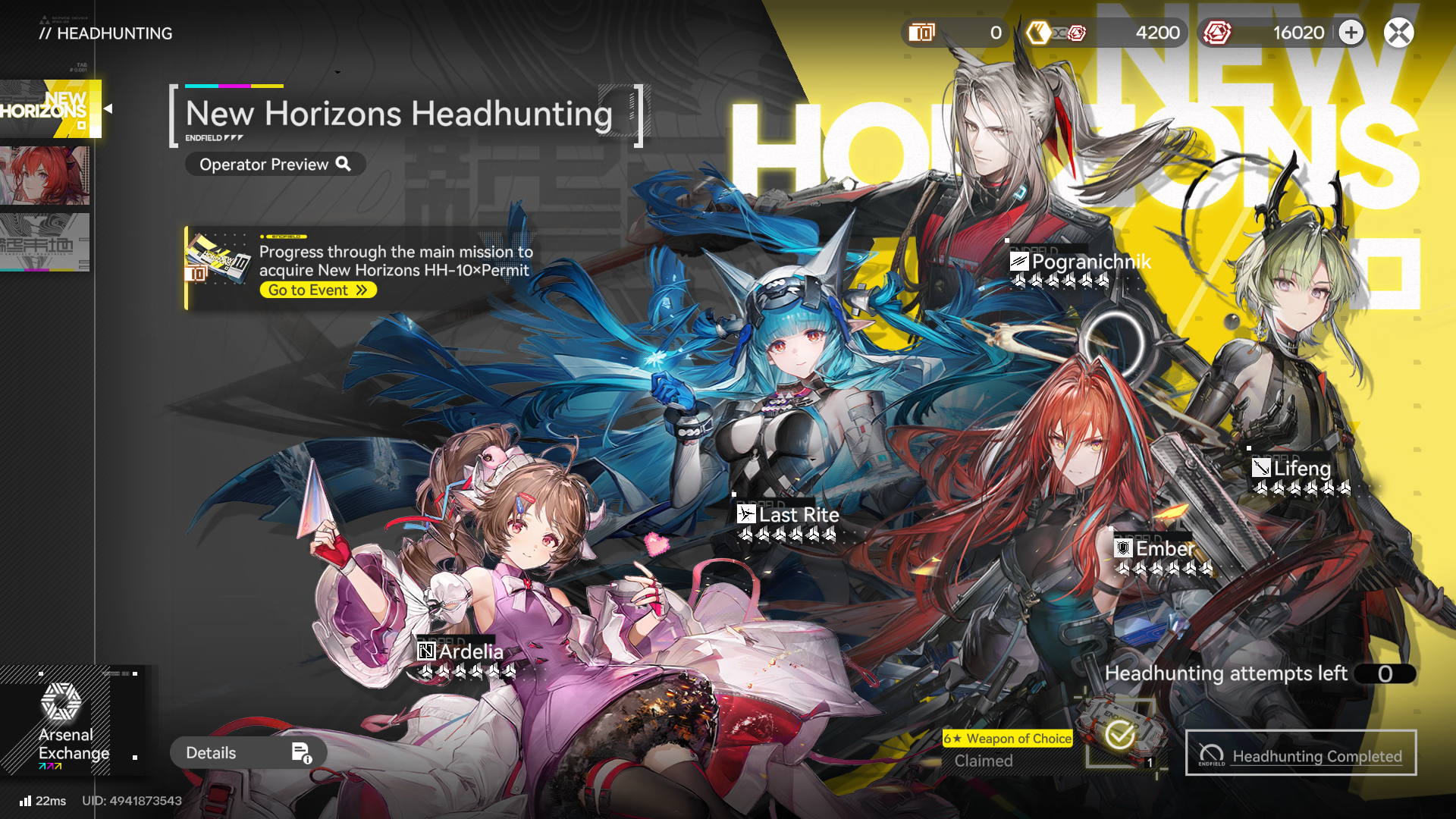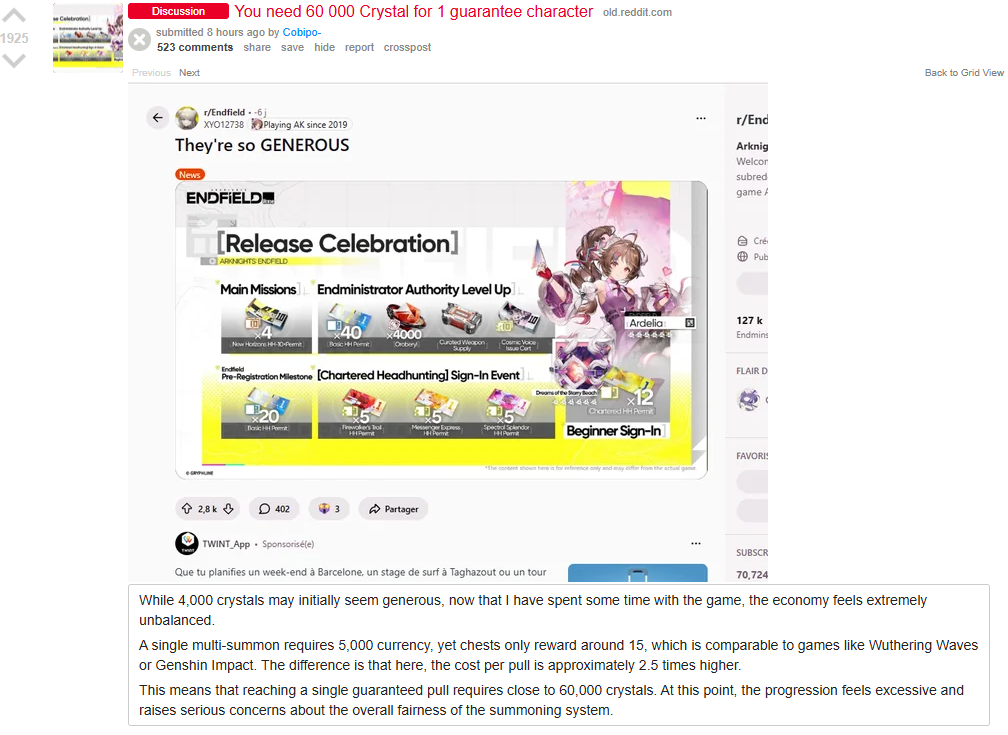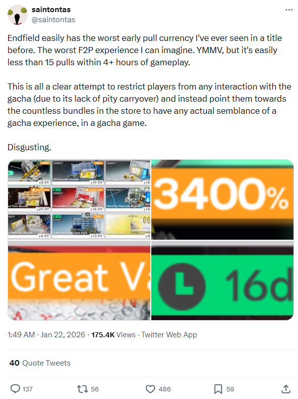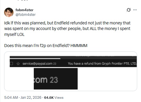 Previous thread: >>554792478SERVERS ARE OPEN!>Official Websitehttps://endfield.gryphline.com/en-us>Official EN X (NEWS HERE)https://x.com/AKEndfield>LAUNCH DATE AND TIMES:NOWFIELD>Platforms/Where to DownloadWindows/PC - Epic Games Store and standalone launcher (Downloadable on the official website)Android - Google Play StoreiOS - App StorePlayStation 5 - PlayStation Store>Launch Reward CodesValid from Release to January 29th, 11:59 PM (UTC +8) (Redeem in-game)RETURNOFALLALLFIELDENDFIELDGIFTENDFIELD4PC>Voyage to the Stars (Special event to launch your name into space)January 16th, 09:00 PM (UTC +8), to March 4th, 11:59 PM (UTC +8)https://endfield.gryphline.com/activity/voyage-to-the-stars/en-us/>Special Launch Streamhttps://www.youtube.com/watch?v=dz2g_D52NR0 [Open]>Official Release Trailerhttps://www.youtube.com/watch?v=oJ00ggFb8A0 [Open]>Official Release PV'shttps://www.youtube.com/watch?v=5Xm45NwWOlo [Open]https://www.youtube.com/watch?v=UPpeeft1-8o [Open]https://www.youtube.com/watch?v=tN80M6IEMo0 [Open]>f2p?Yes, on all platforms, but you can buy an optional launch bundle on the PS5 for $9.99.>Wikishttps://wiki.skport.com/endfield (Official)https://perlica.moehttps://warfarin.wiki/enhttps://endfield.wiki.gg/>System Requirementshttps://perlica.moe/system-requirements>Operators (Playable characters)https://warfarin.wiki/en/operators>Stickershttps://drive.google.com/drive/folders/13KH3L6QPIKkVH7pBddv4uxwmwJsnOtklhttps://drive.google.com/drive/folders/1OuVtjv1k-9c3M6n7d4PX3CGG5bkwH04ahttps://drive.google.com/drive/folders/1AStB8bzFk3lSwMwczWPkFYCBrZe0vHOghttps://drive.google.com/drive/folders/1yS0lqUhxf8tBRtpDFfCU1y16IS2sSeF7