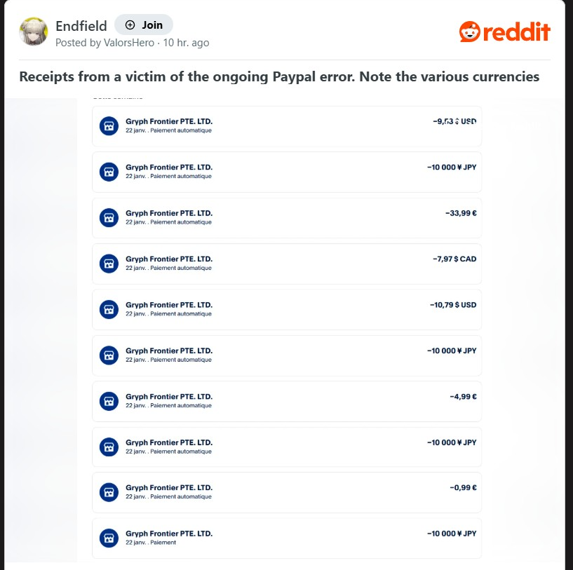 Arknights: Endfield launched today with a major PayPal payment bug.Players attempting purchases were charged random amounts, often for other people's transactions in various currencies.Some reported charges totaling hundreds of dollars for small items like a $10 battle pass.GRYPHLINE quickly took PayPal offline. They're investigating and promising to handle abnormal transactions (refunds and item delivery issues).