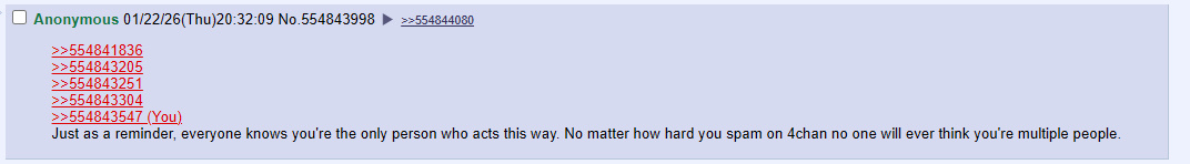 >>554829668>>554829646Thanks for having the exact same behavior pattern across the whole site. Makes you stand out a lot.