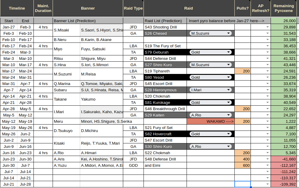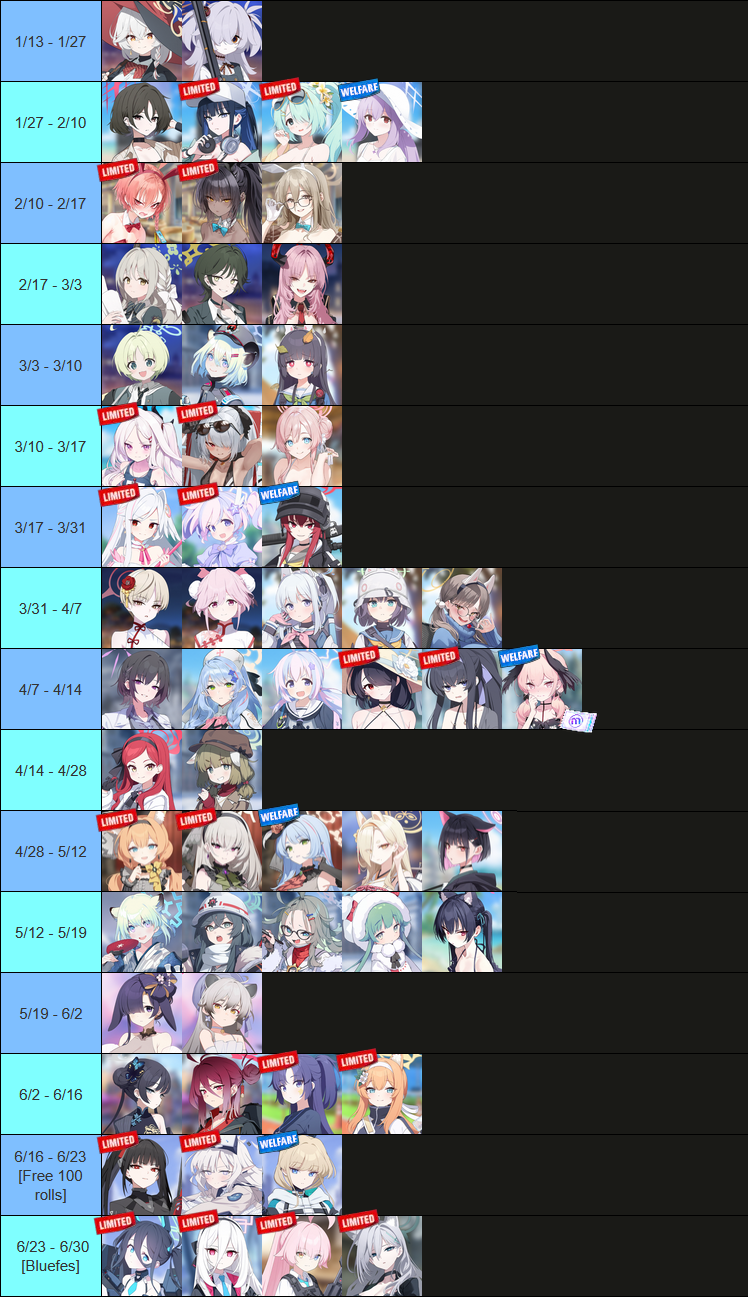 Previous Thread: >>554806301>Guides, Resources and useful links:https://rentry.org/bagguides>/bag/Circles/Clubs/Friends:https://rentry.org/holdingthebag>4koma, Manga, Side Content, PVs & Shortshttps://rentry.org/bacontent>>(JP) – JST>Banners:>1/20 After Maint – 1/29 10:59Rio (Battle – Limited)Himari (Battle – Limited)Toki (Battle – Welfare)>News:Patch notes: https://bluearchive.jp/news/newsJump/624>Events:Steel Continent Assault – 1/20 After Maint – 1/29 10:59100-Free Recruitment Event – 1/20 After Maint – 1/29 10:595th Anniversary Login Bonus – 1/20 After Maint – 2/12 10:59>Content:Limit Break Assault: Chokmah (Field w/Special Armor) – 1/21 11:00 – 2/12 3:593x Bounty/Normal/Hard – 1/20 4:00 – 1/25 3:592x Account EXP – 1/24 4:00 – 1/26 3:593x Commission/Lesson – 1/25 4:00 – 1/29 3:593x Bounty/Normal/Hard – 1/29 4:00 – 2/5 3:593x Commission/Lesson – 2/5 4:00 – 2/12 3:592x Account EXP – 2/7 4:00 – 2/9 3:59>>(GLOBAL) – UTC>Banners:>1/13 After Maint – 1/27 1:59EriKanoe>News:Patch notes: https://forum.nexon.com/bluearchive-en/board_view?thread=3336837>Events:We Are the Occult Investigation Society! Ancient Spells and Mysteries – 1/13 After Maint – 1/27 1:59My Office: https://bluearchive.nexon.com/user/myoffice>Content:Total Assault: Perorodzilla (Field) – 1/20 2:00 – 1/26 18:59Joint Firing Drill (Shooting) – 1/27 2:00 – 2/2 18:59Limit Break Assault: Chokmah (Field – w/Special Armor) – 1/14 2:00 – 2/9 18:592x Normal – 1/19 19:00 – 1/26 18:592x Account EXP – 1/23 19:00 – 1/25 18:592x Lesson/Scrimmage – 1/26 19:00 – 2/2 18:59