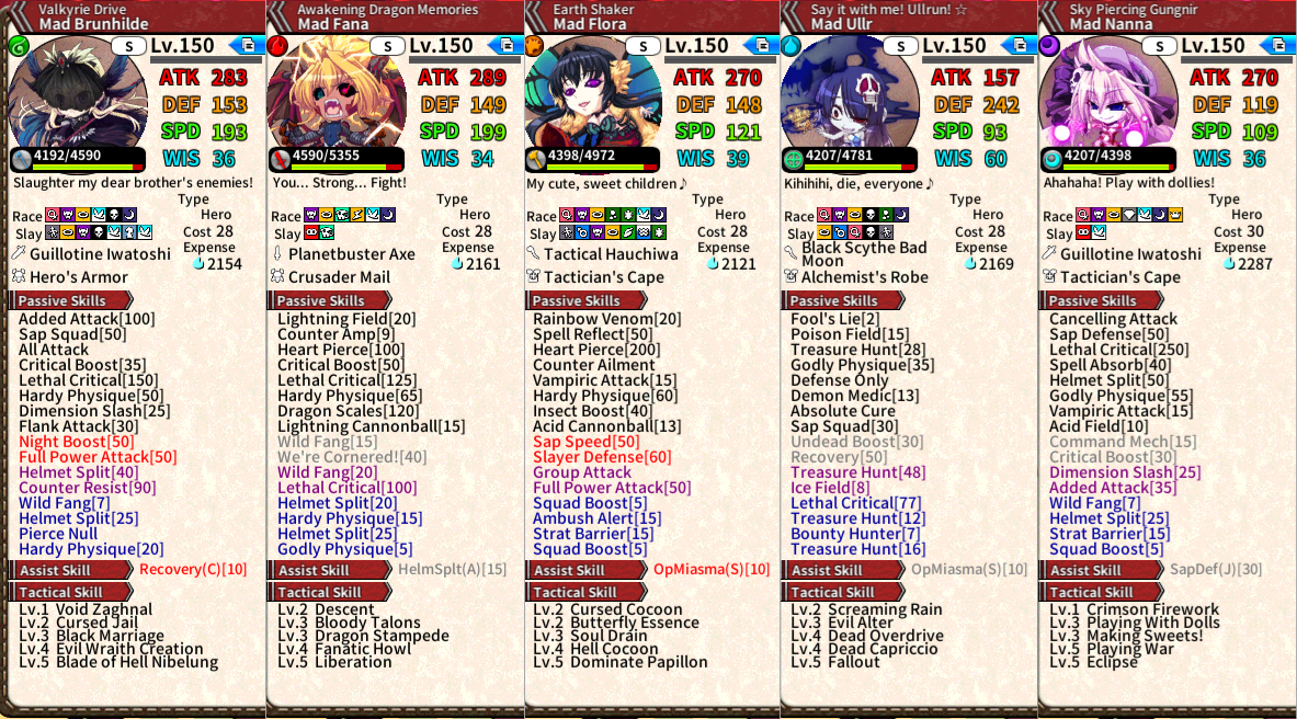 I'm not sure what to make of them. All of them are Night units, they lose important skills, notably Fana lost Wild Fang, and Ullr has an eye bigger than the other because one of her eye is rotting, but they also gain extremely good skills. Fana seems to be the Altered Celias of this game, insane offense at the cost of everything else to show how important it is. Mad Fana and Flora look very usable. Hilde got dap Squad 50 on top of a Night Boost 50 is insane but I'm not sure if it's better than Evil Hilde's Squad Boost 35 and Sap Squad 25.>>554995527Half the stats are pretty big though, but I see what you mean.>I guess the Attack/ Speed Formation applies to the entire party despite how it's wordedFormation always forked as a sort of Boost that activate when you have 4 or more units in a div, so all the time unless you fuck up.The wording doesn't make it clear if it made the unit, or the other units. Big L dev and translation team.