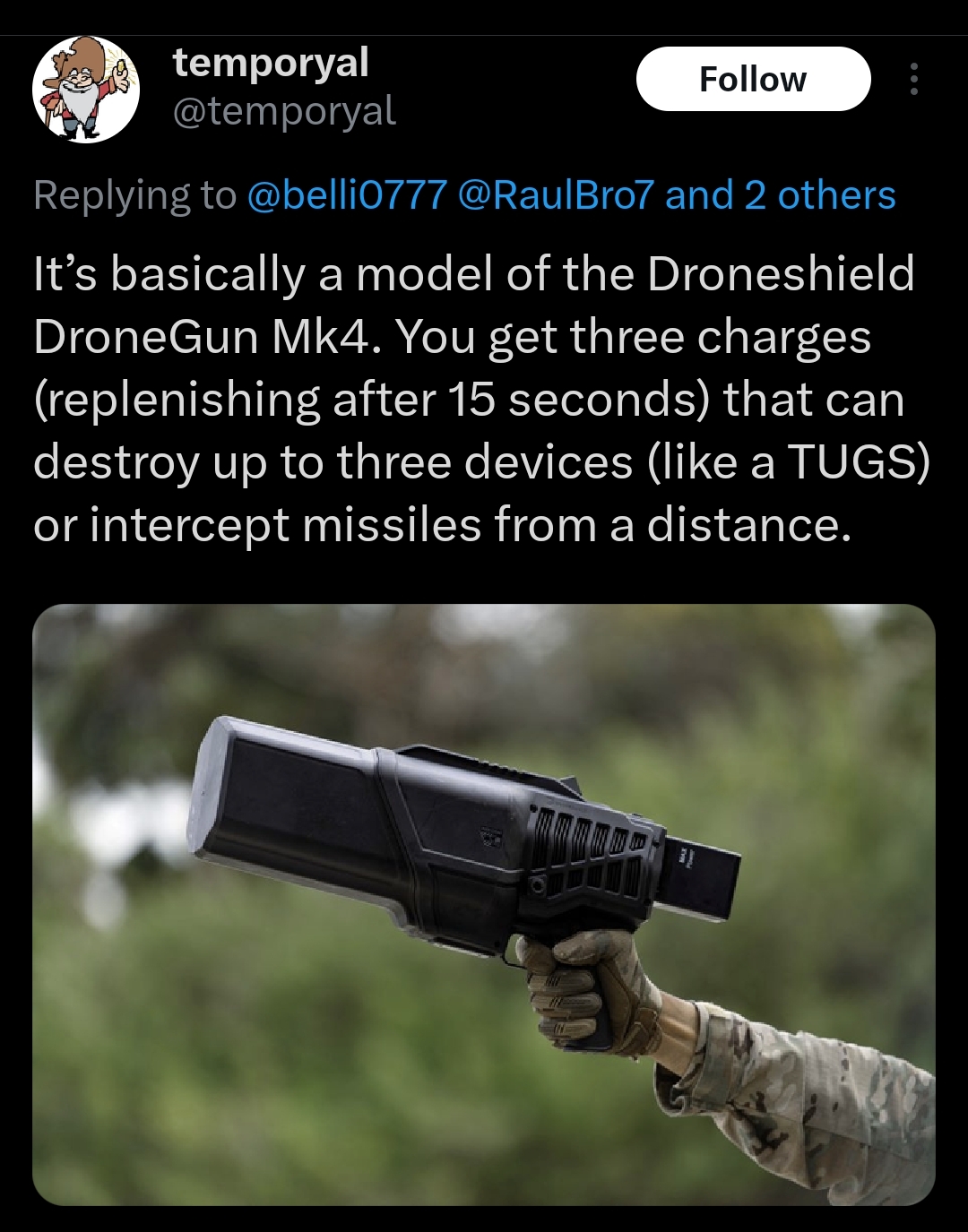 Temporyal datamined an "anti-drone" gun that can destroy gadgets and incoming missiles.