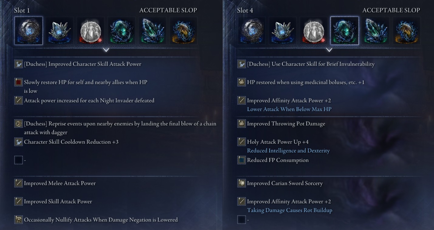 list of ydbtg (nonexhaustive)>Ironeye>Recluse>Duchess (Sorcery)>Duchess (2Balancer)>Raider (Greatbow)>Any character (Halo Scythe)Add the RSS feed so you don't embarrass yourself by not knowing others not mentioned here or future additions