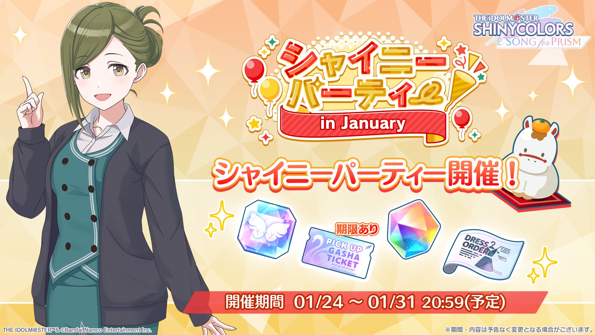 >>555000340SHINY COLORS>>Event01/09 - 01/30 11:59AM JST "2nd Shiny Act"01/20 - 01/30 11:59AM JST Rerun Scenario "Time of Good-byes" (SSRS Kiriko)01/20 - 01/30 11:59AM JST Collabo Fes (SRS Tenka)01/01 - 01/31 New Year Campaign 2026>>>Gacha01/20 - 01/30 11:59AM JST Twilights Collection (SSRP Hiori, SSRS Kiriko)01/21 - 01/30 11:59AM 2830 Days Release Commemoration SSR 28.3% Chance! Once-a-day Free Roll>>Has Normal and Paid Jewels Only version01/09 - 01/30 11:59AM JST #SCFantasy "Reckless Holy Lynching" (SSRS Kiriko)01/24 - 02/18 Shuffling Activity 2026 Winter Special Idol (SSRS Hinana)>>Paid Jewels Only01/20 - 01/30 11:59AM JST Guaranteed 10 SSR on STEP301/20 - 02/09 Twilights Collection [SSRS Mano, SSRP Asahi]01/24 - 02/18 Rerun Another Color Swimsuit Costume01/24 - 02/18 Rerun Another Color Swimsuit Costume Tanned Ver.SONG FOR PRISM>>Event01/21 - 01/24 8:59PM JST 6th Technical Challenge Cup01/21 - 01/25 8:59PM JST 11th SHINY COMPETITION2025/12/31 - 01/28 11:59PM JST Season 27 "Request?" (SSR Hana)2025/12/20 - 01/31 Portrait Focus Mode Mission01/21 - 01/31 New 2D MV Song Mission01/24 - 01/31 Shiny Party in January01/10 - 02/20 Episode Zero Chapter 5 Mission01/24 - 02/23 OathONE Commemoration Mission01/21 - 02/28 Portrait Focus Mode Mission #2>>>Gacha01/24 - 02/23 Rerun SfP x 765 Pro Collab (3* Lim Haruka, 3* Lim Makoto, 3* Lim Takane)01/24 - 02/23 Rerun SfP x 765 Pro Collab 2 (3* Lim Haruka, 3* Lim Chihaya, 3* Lim Miki, 3* Lim Makoto, 3* Lim Takane)>>Has Normal and Paid Jewels Only version2025/12/31 - 01/31 "PJ: REFRAC7IONS - Sonic Heart (and Signal)" (3* Lim Hinana, 3* Lim Meguru, 3* Lim Kaho, 3* Lim Kogane)01/21 - 01/31 "A Fire Kept Inside" (3* Chiyuki, SSR Chiyuki)01/24 - 02/23 SfP x 765 Pro Collab 4 (3* Lim Chihaya)