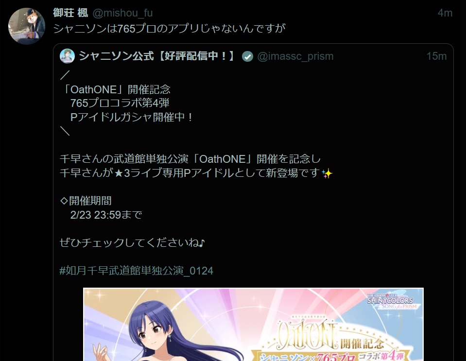 iDOLM@STER ThreadPrevious iM@S Thread: >>554882204Official website: idolmaster-official.jpJapanese news: imasnews765.comEnglish wiki: project-imas.wikiAPKs: apk.ksmz.moeOld archive of materials: sites.google.com/view/yukipobackupOld FAQ + Resource Links: pastebin.com/icRtaLvvMaterial translations + Music downloads: pastebin.com/DebHdukECharacter birthdays: pastebin.com/cLdezeDuNext thread OP: pastebin.com/A5UGxTuBHelpful Links: pastebin.com/Z70CGAsN>Event/Gacha Dates (Jan 21st): >>554643551 >>554643612- Previous News: >>554882265 >>554882302TODAY:Jan 24th, 5PM JST: Chihaya Solo Live "Oath ONE" DAY 1 in Nippon Budokan: youtu.be/0IqRzNotQ8U >>554758934Jan 24th, 8PM JST: Chihaya Solo Live "Oath ONE" DAY 1 AP stream: youtu.be/EQ4-8FSdH0AJan 24th, 9PM JST: VL Cosmo plays gogh: Focus with Your Avatar: youtu.be/gzE3vym6sKkJan 24th: Shiny Colors x 30 MINUTES SISTERS Chiyoko/Rinze: >>554441987Jan 24th to Mar 8th: Gakuen x Tobu Zoo collab: >>550851259Jan 24th to Apr 23rd: SideM Beit x Solo Photo Wedding "Shining Moments Produced by Beit" collab: >>548495642 >>548497993 >>548494553TOMORROW:Jan 25th, 4PM JST: Chihaya Solo Live "Oath ONE" DAY 2 in Nippon Budokan: youtu.be/l5F7IdCCmLo >>554758934Jan 25th, 8PM JST: Chihaya Solo Live "Oath ONE" DAY 2 AP stream: youtu.be/togfxyfxhrg