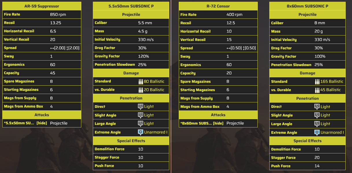 Now that Stealth is implemented into the game in a way that has an actual tangible effect and isn't just "You haven't been seen yet.", there's a braindead easy solution to giving all players, both old and new, easy access to stealth weaponry: supressors.>Sub-sonic munition means less damage and range>Bullet drop off isn't as severe>Integrally supressed weapons always have a slight damage advantage over any externally supressed weapon>Less sway but more drag means small magazines are needed to achieve results as snappy as without the supressorDoesn't have to be every weapon just the most basic of them and a few that'd make some sense so no stuff like the Reprimand, Breaker Variants, Diligence Counter, Coyote, Pacifier and so forth because those use specialized ammo which wouldn't have subsonic ammo variants for them.