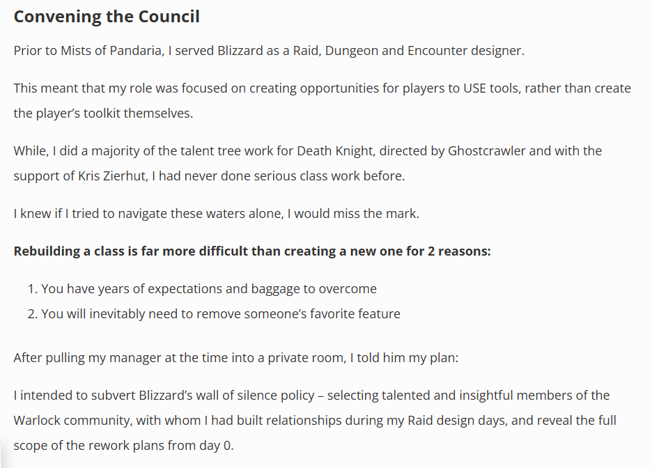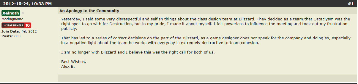 >>555014645The corporate story is difference in design philosophy, he didn't agree with the direction they wanted to go with WoD mostly around class fantasy iirc.What was left out of that big post is that Xelnath also publicly went on a rant around the time complaining to the players and not keeping affairs internal.Only thing that remains is his apology iircHe released a post mortem few years ago giving his own take on the situationhttps://xelnath.com/2016/08/21/post-mortem-x-warlocks-in-pandaria-part-1/