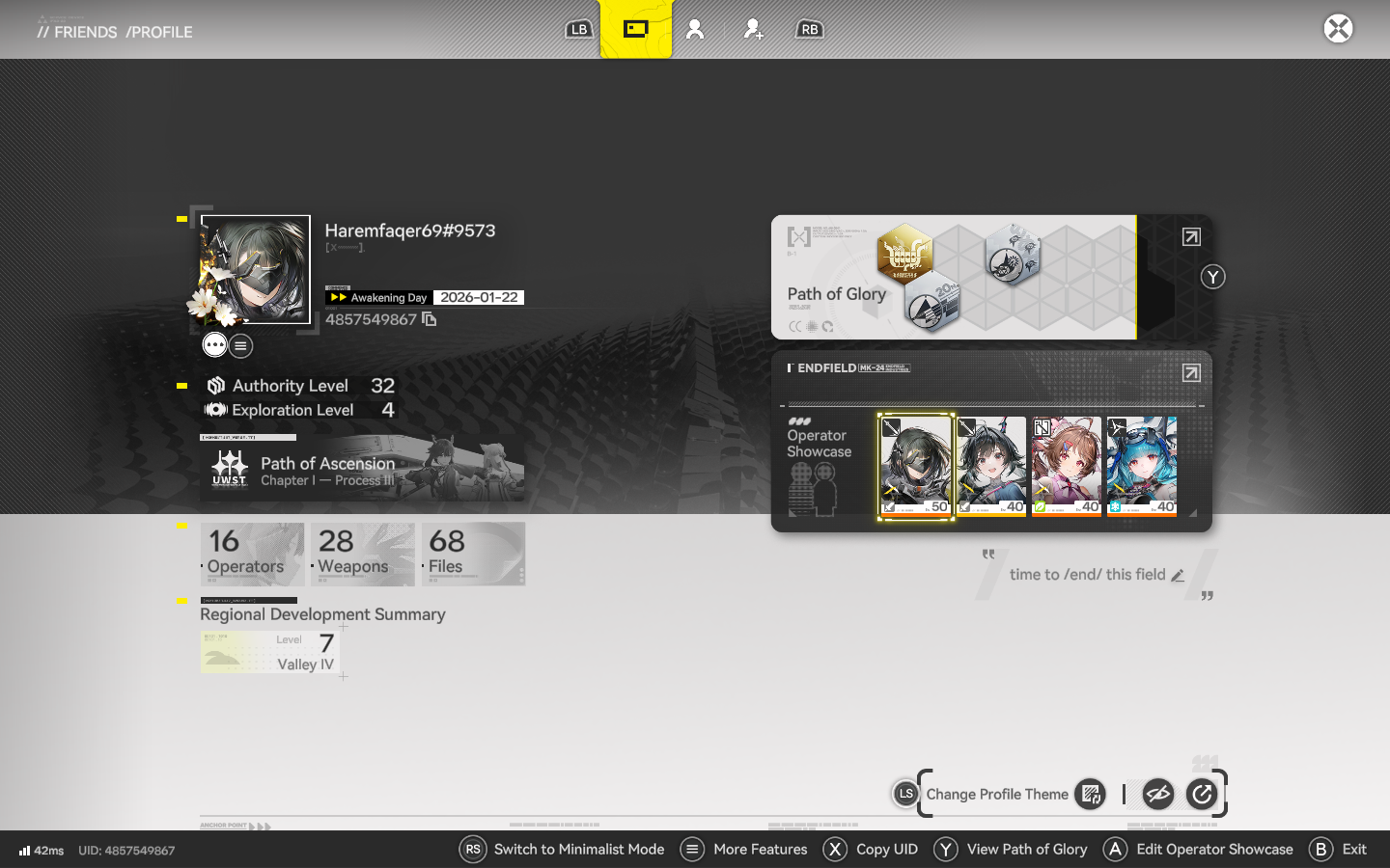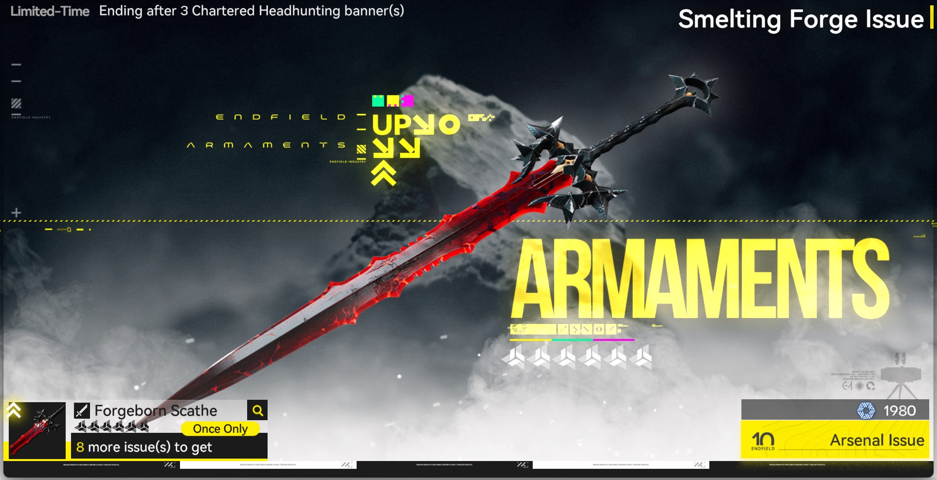 Previous thread: >>554967613FUNFIELD>Official Websitehttps://endfield.gryphline.com/en-us>Official EN X (NEWS HERE)https://x.com/AKEndfield>Chartered Headhunting ScheduleJanuary 21st to February 7th --- "Scars of the Forge", (Laevatain)February 7th to February 24th --- "The Floaty Messenger", (Gilberta)February 24th to March 13th --- "Hues of Passion", (Yvonne)>Launch Reward Codes (Valid until January 29th)RETURNOFALLALLFIELDENDFIELDGIFTENDFIELD4PC>Voyage to the Stars (Ongoing until March 4th)https://endfield.gryphline.com/activity/voyage-to-the-stars/en-us/>Special Launch Streamhttps://www.youtube.com/watch?v=dz2g_D52NR0>Official Release Trailerhttps://www.youtube.com/watch?v=oJ00ggFb8A0>Official Release PV'shttps://www.youtube.com/watch?v=5Xm45NwWOlohttps://www.youtube.com/watch?v=UPpeeft1-8ohttps://www.youtube.com/watch?v=tN80M6IEMo0>Wikishttps://wiki.skport.com/endfield (Official)https://perlica.moehttps://warfarin.wiki/enhttps://endfield.wiki.gg/>Blueprint Guideshttps://talospioneers.com/en>Stickershttps://drive.google.com/drive/folders/13KH3L6QPIKkVH7pBddv4uxwmwJsnOtklhttps://drive.google.com/drive/folders/1OuVtjv1k-9c3M6n7d4PX3CGG5bkwH04ahttps://drive.google.com/drive/folders/1AStB8bzFk3lSwMwczWPkFYCBrZe0vHOghttps://drive.google.com/drive/folders/1yS0lqUhxf8tBRtpDFfCU1y16IS2sSeF7
