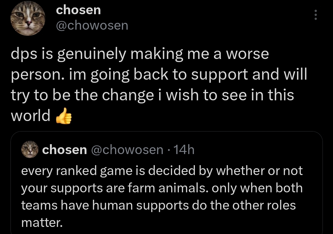 >>555047494>>555047692part of me just wants to make a make a smurf elo crashing account just to try to ruin these tier lists by playing the highest rated heroes the worst ways possible