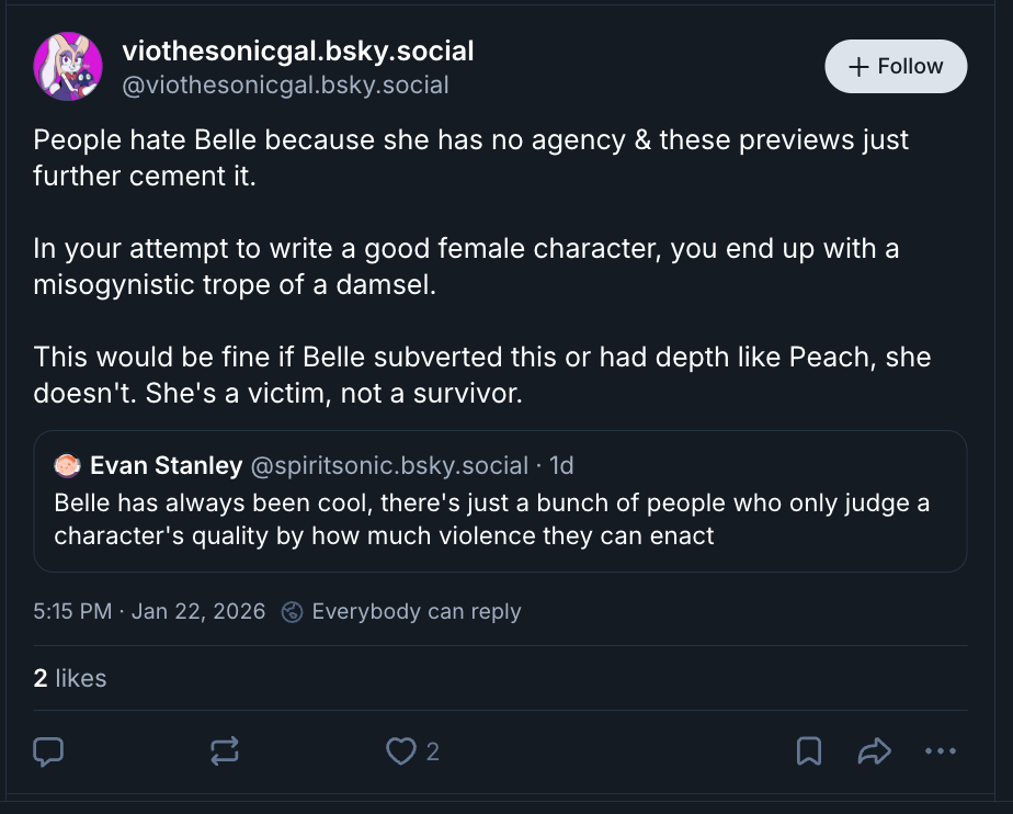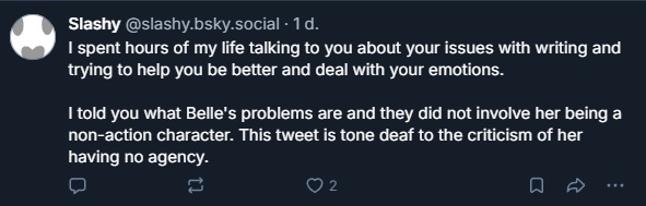 >>554998328“Capacity for violence” is just Evan seething that Belle can’t do anything other than cry about her backstory which only Evan thought was deep.