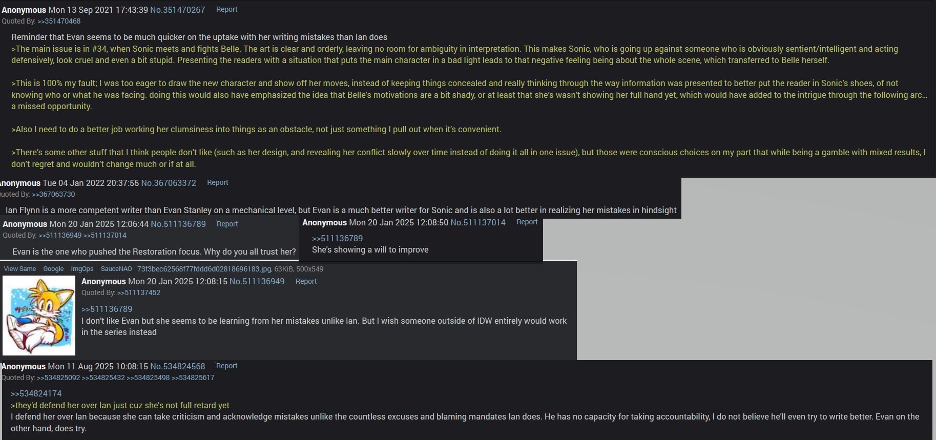 >>554995625>I defend her over Ian because she can take criticism and acknowledge mistakes unlike the countless excuses and blaming mandates Ian does. He has no capacity for taking accountability, I do not believe he'll even try to write better. Evan on the other hand, does try.Oh, I can only imagine what that anon felt when Evan proved to be just the same about trying to let Sega take the fall for her flaws during Lunar.