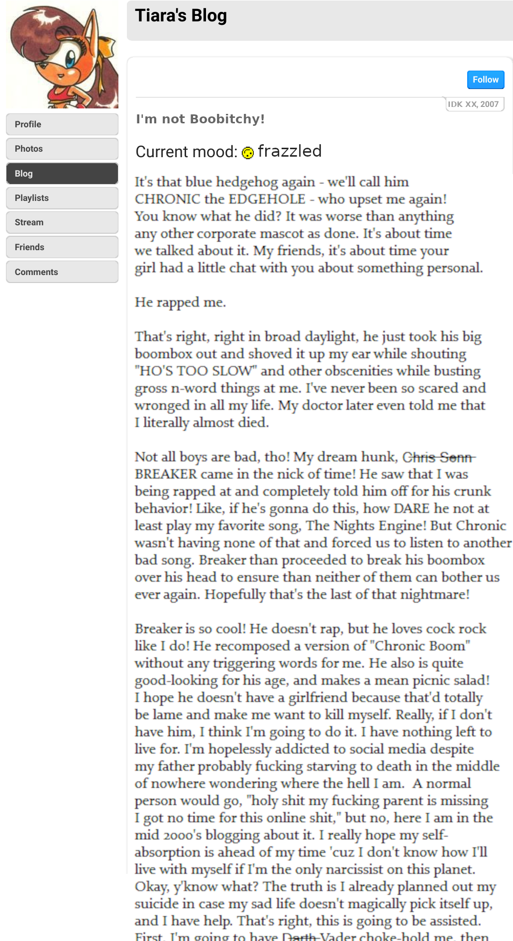 >>555038527qrd?I like Zooey, a pleasant normie fox girl who doesn'ts mind Tails' mutation is fine for him, plus I hear a light lisp in her voice so I imagine she knows what it's like to get bullied over something you can't control too.