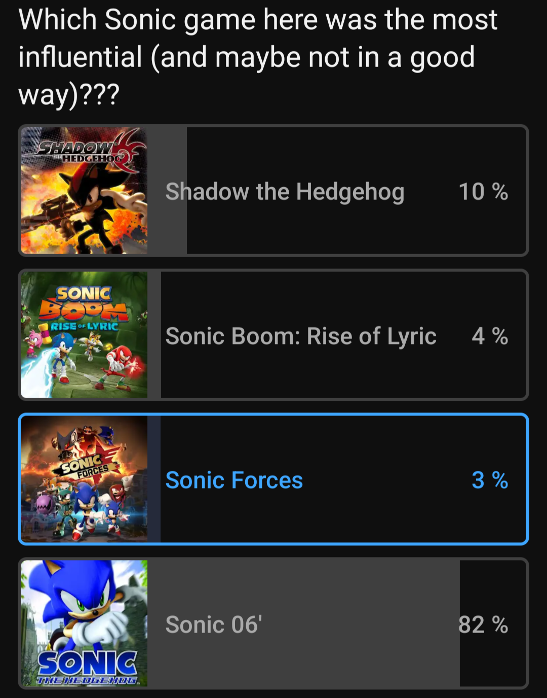 I’m genuinely shocked there are Sonic fans who mainly play on PC.That’s like saying you’re a big fan of shooters and sports games and mainly playing on mobile