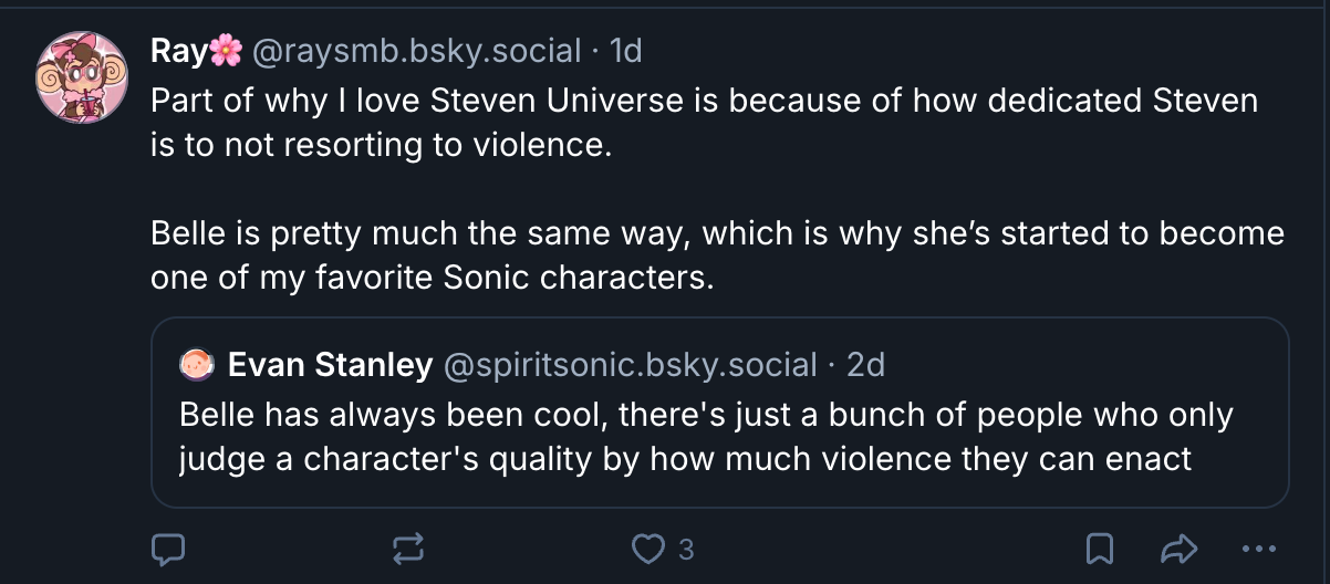 >>554994235Oh so Evan's just genuinely retarded okay. Belle's problem is not about not being an action character. The Chaotix are not generally action focused characters, Jewel is also not an action focused character, Cream is also not an action focused character, people still like these characters. Belle has issues of her own from you writing her into a narrative dead end and you're bitter people don't like this dogshit oc.