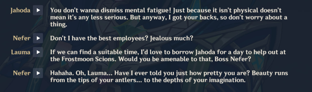 >“I think Columbina seems to like Sandrone very much. And because of that affection, it’s kind of… how should I put it… (laughs). She’ll tease her without any bad intentions, or say things like that when they’re playing games together, and then Sandrone will go, like, “Grrr!” and get all worked up. But then sometimes, she’ll suddenly soften up and act all sweet, so I just find Sandrone really adorable. I really like the relationship between the two of them, so yeah Sandrone definitely catches my interest!"Cute AND canon.